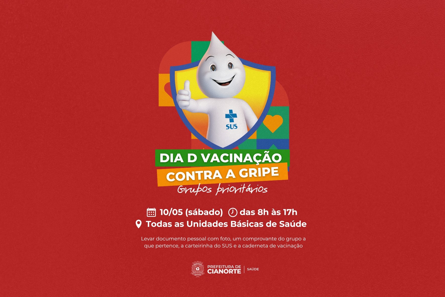 A mobilização acontecerá em todas as Unidades Básicas de Saúde (UBS) do município, das 8h às 17h, sem pausa para o almoço. Para se vacinar, é imprescindível a apresentação de um documento pessoal com foto, um comprovante da sua condição (carteirinha do SUS, carteira de vacinação, declaração médica, etc.) e a caderneta de vacinação.