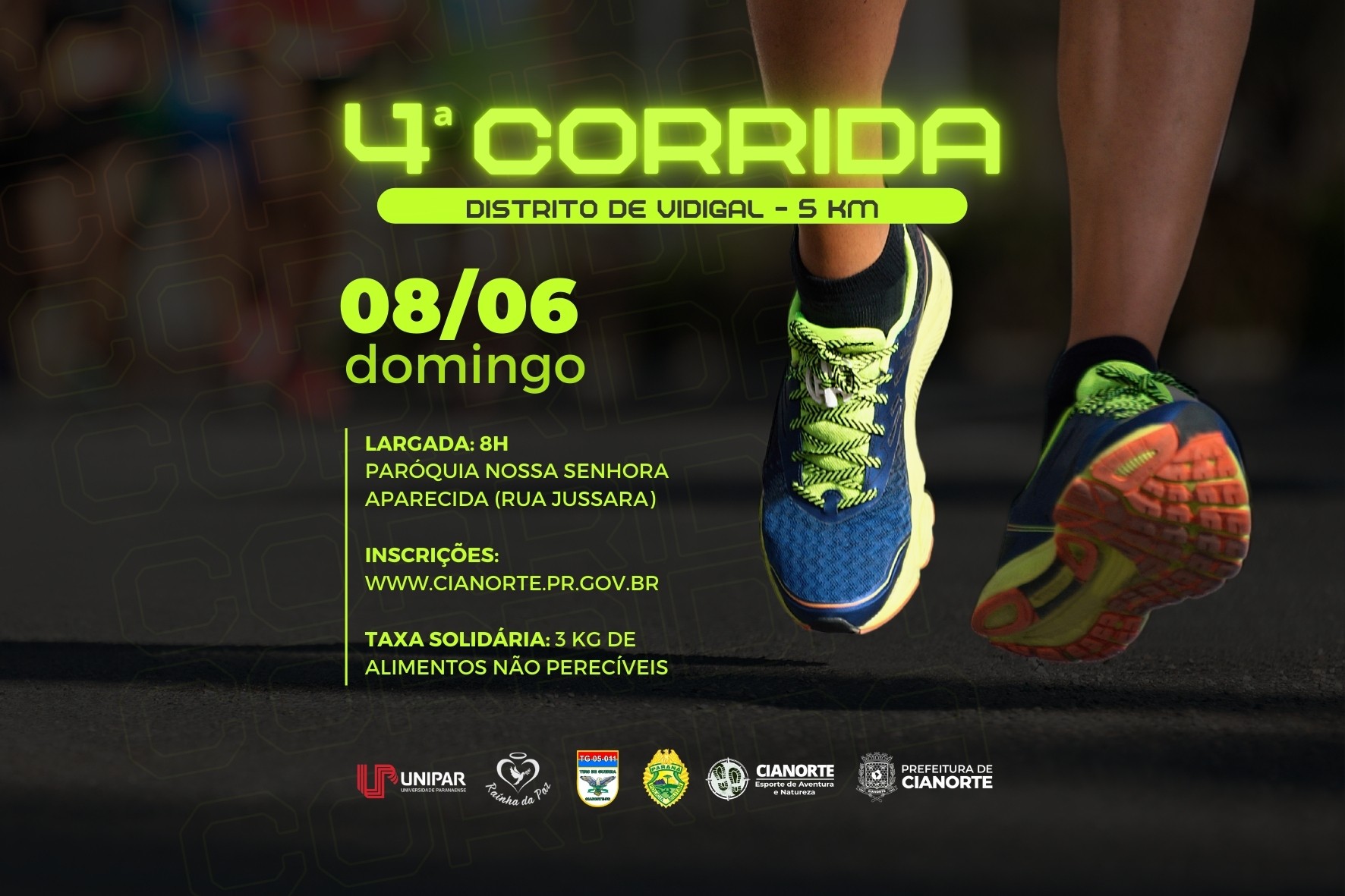 Os amantes da corrida de rua têm uma ótima oportunidade de praticar a atividade em âmbito competitivo: vem aí a 4ª Corrida do Distrito de Vidigal. O evento está marcado para 8 de junho (domingo), com largada às 8h, em frente à Paróquia Nossa Senhora Aparecida (Rua Jussara). As inscrições começam nesta quarta-feira (07), por formulário on-line, disponível no site do Município (www.cianorte.pr.gov.br), com acesso direto pelo link: https://forms.gle/g6naeNEyuYgcVwP7A. O prazo é até 30 de maio, podendo ser encerrado com o preenchimento das vagas.