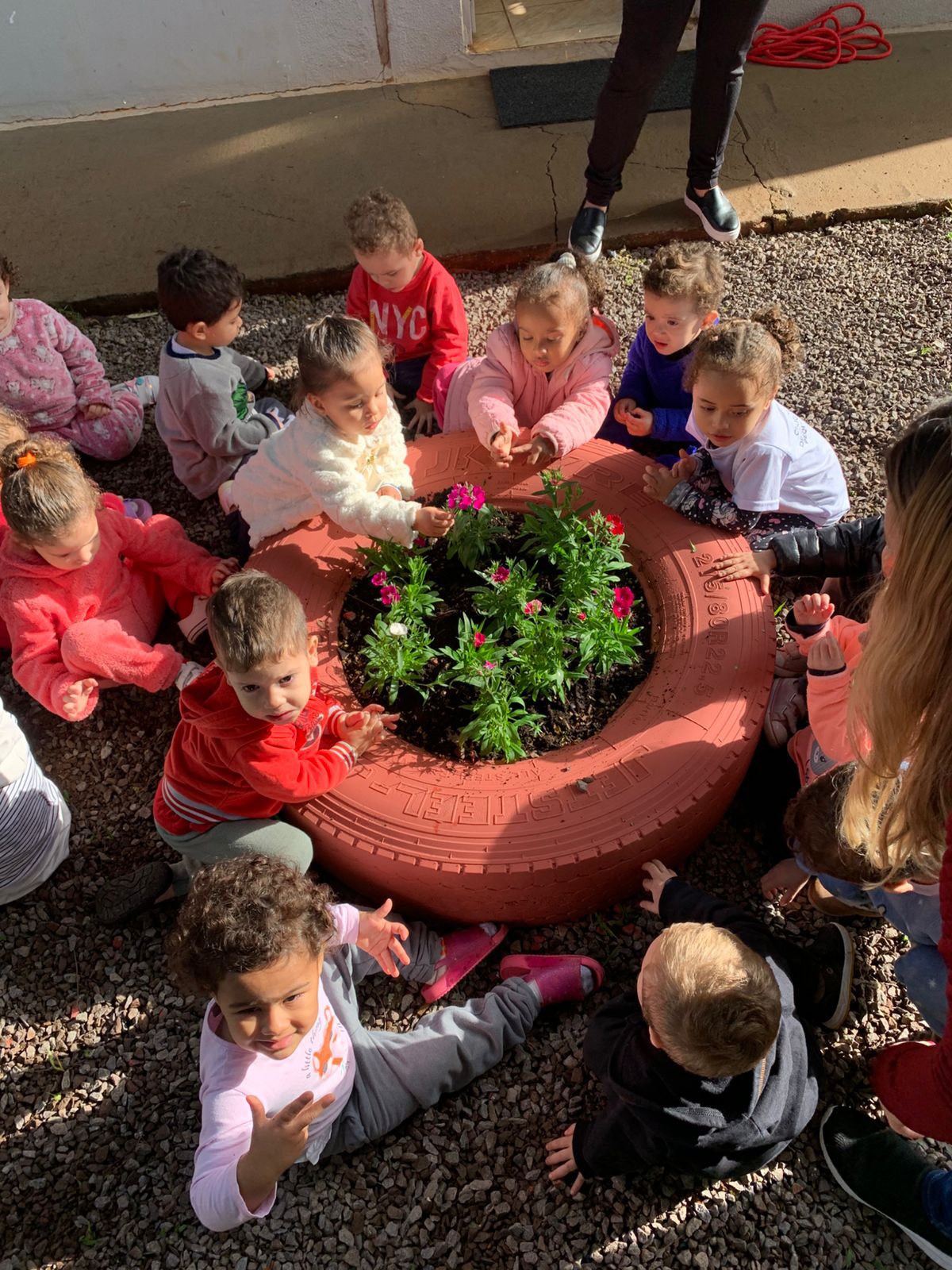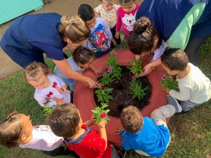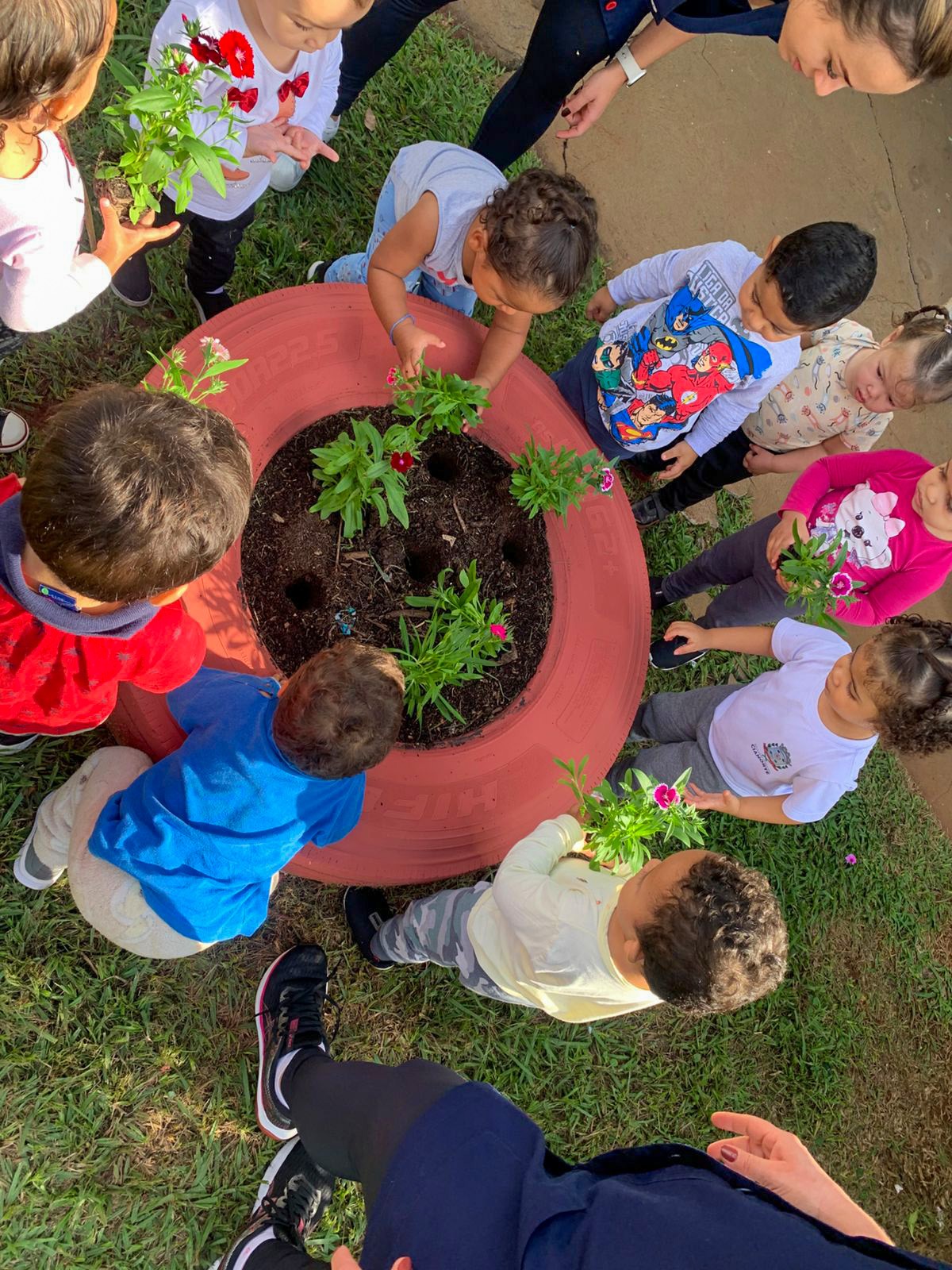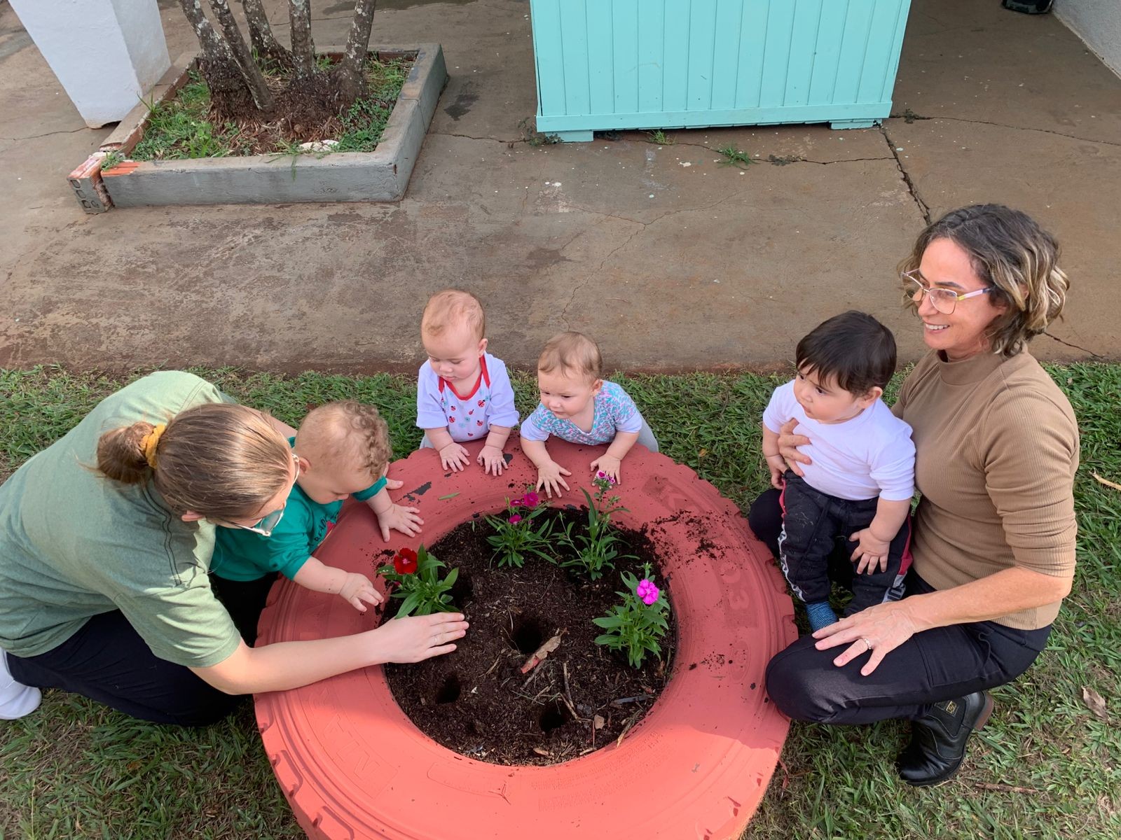 Durante a semana, as seis turmas atendidas pela instituição participaram do plantio de mudas de flores em pneus reciclados. A proposta teve como objetivo incentivar, desde a primeira infância, o cuidado com a natureza e a importância da reciclagem, promovendo atitudes sustentáveis no dia a dia das crianças.