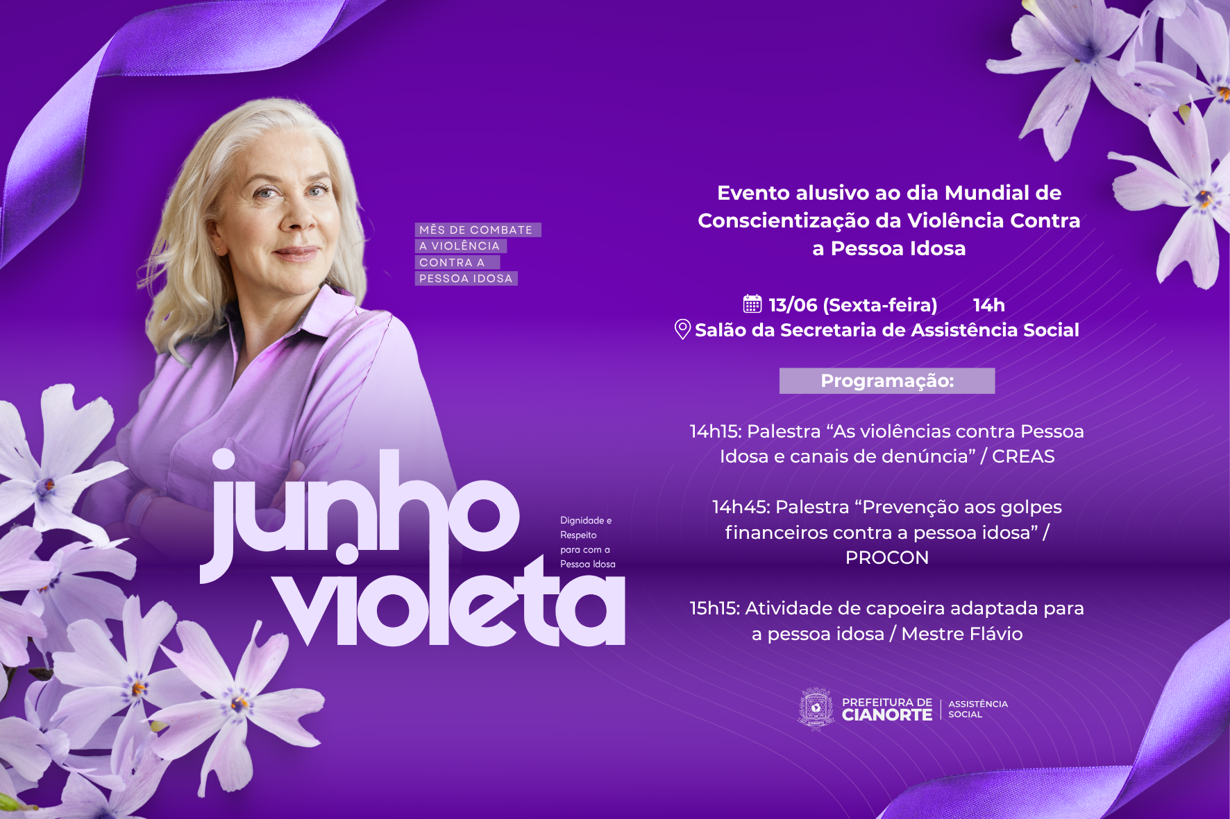 Em um esforço contínuo para combater a violência contra a pessoa idosa, Cianorte se prepara para uma tarde de conscientização e educação nesta sexta-feira (13). O evento, parte da campanha Junho Violeta, faz alusão ao Dia Mundial de Conscientização da Violência Contra a Pessoa Idosa, celebrado anualmente em 15 de junho. As atividades terão início às 14h, no Salão da Secretaria de Assistência Social, e são abertas a toda a comunidade.