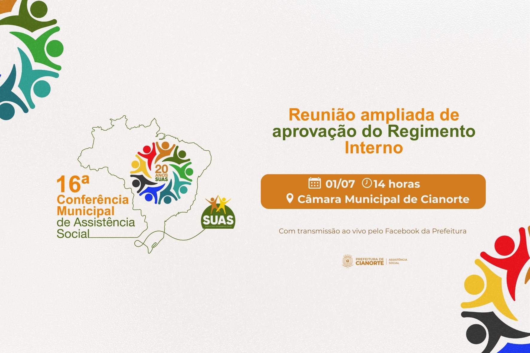 Os munícipes de Cianorte têm um importante compromisso nesta quarta e quinta-feira (02 e 03). Trata-se da 16ª Conferência Municipal de Assistência Social, um evento crucial para debater e aprimorar as políticas públicas voltadas ao setor. A iniciativa será no Auditório da UMFG (Rod PR-082, km 468). No primeiro dia, das 13h às 17h e, no segundo, das 8h às 12h e das 13h às 17h.