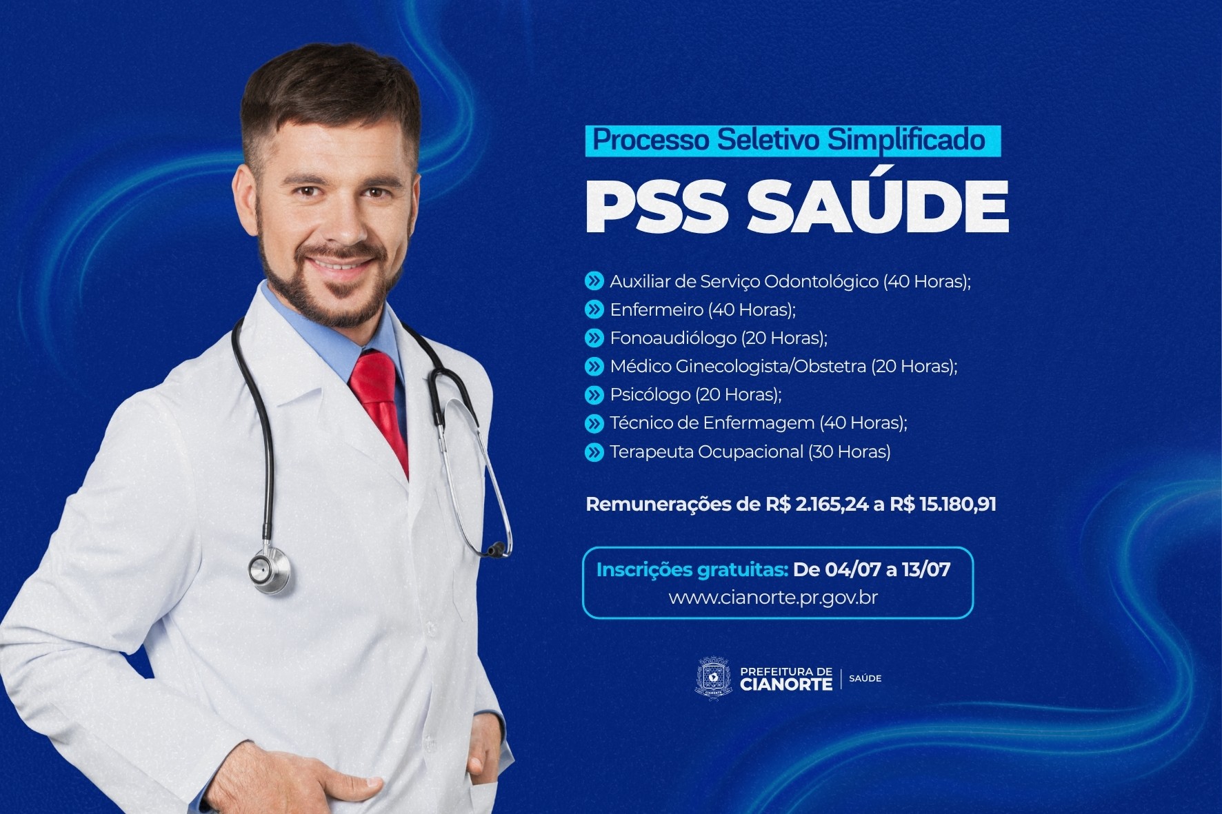 Profissionais interessados em participar do Processo Seletivo Simplificado (PSS) da Secretaria Municipal de Saúde, para a contratação temporária de diversos cargos, devem se apressar. Isso, porque termina neste domingo (13) o prazo de inscrições. As remunerações variam de R$ 2.165,24 a R$ 15.180,91.