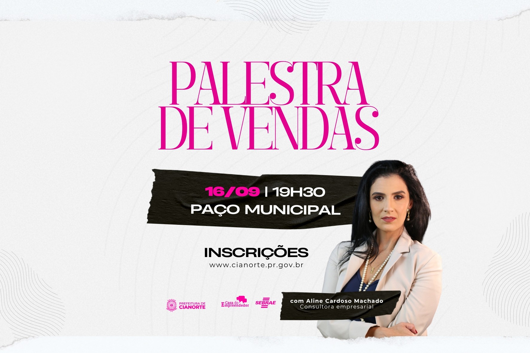 A Prefeitura de Cianorte, por meio da Secretaria Municipal de Desenvolvimento Econômico, em parceria com o Sebrae, promove uma palestra gratuita sobre vendas no dia 16 de setembro, às 19h30. O evento acontecerá no Paço Municipal e será conduzido por Aline Cardoso Machado, consultora empresarial.