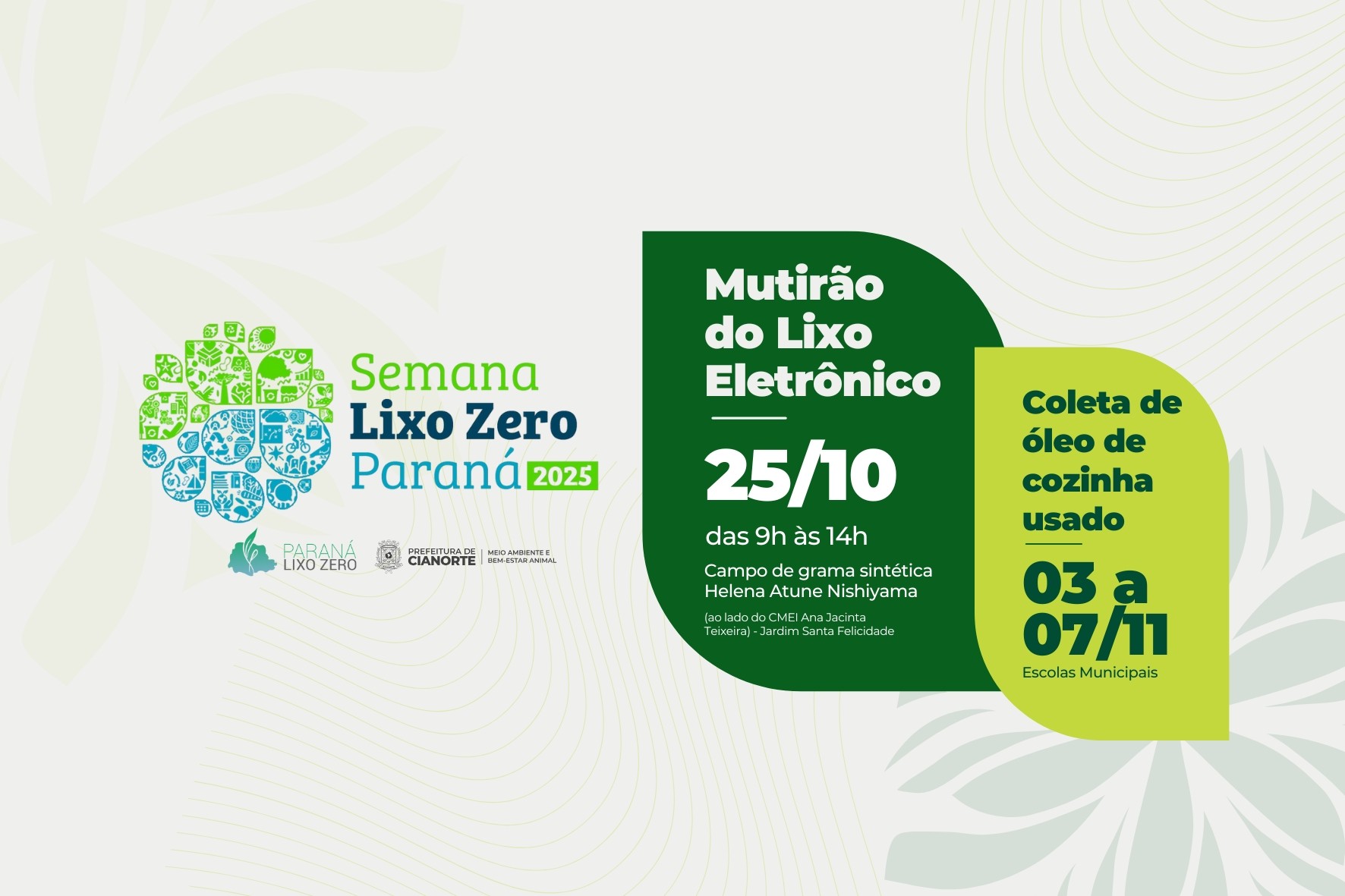 Como parte da Semana Lixo Zero, iniciativa que busca alcançar todos os municípios paranaenses, promovendo uma ampla sensibilização e ações efetivas por um futuro mais verde, conforme instituído pela Lei Estadual 19.979/2019, Cianorte promoverá duas ações que reafirmam seu compromisso com a sustentabilidade e a gestão responsável de resíduos.