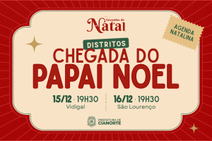 “O Natal é uma época de união, esperança e alegria, e essa magia deve chegar a todos. Levar o Papai Noel e espetáculos teatrais de qualidade para Vidigal e São Lourenço é o nosso compromisso em garantir que todas as famílias cianortenses, nos distritos e na sede, tenham acesso a momentos de lazer e confraternização. Reforçamos o convite aos moradores para que participem destas ocasiões, preparadas com muito carinho”, afirmou o presidente da Comissão Organizadora e secretário municipal de Cultura, Evandro de Castro.