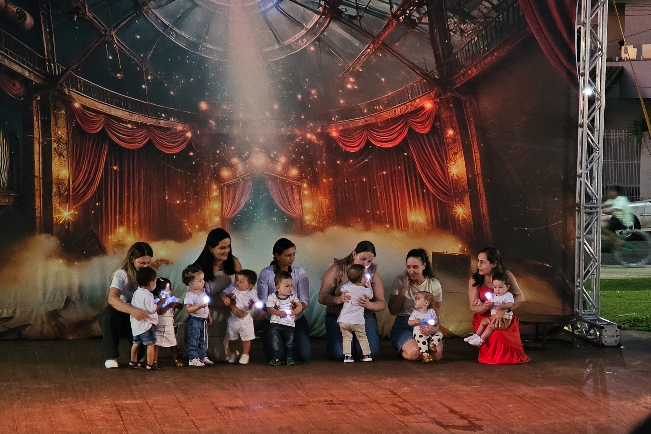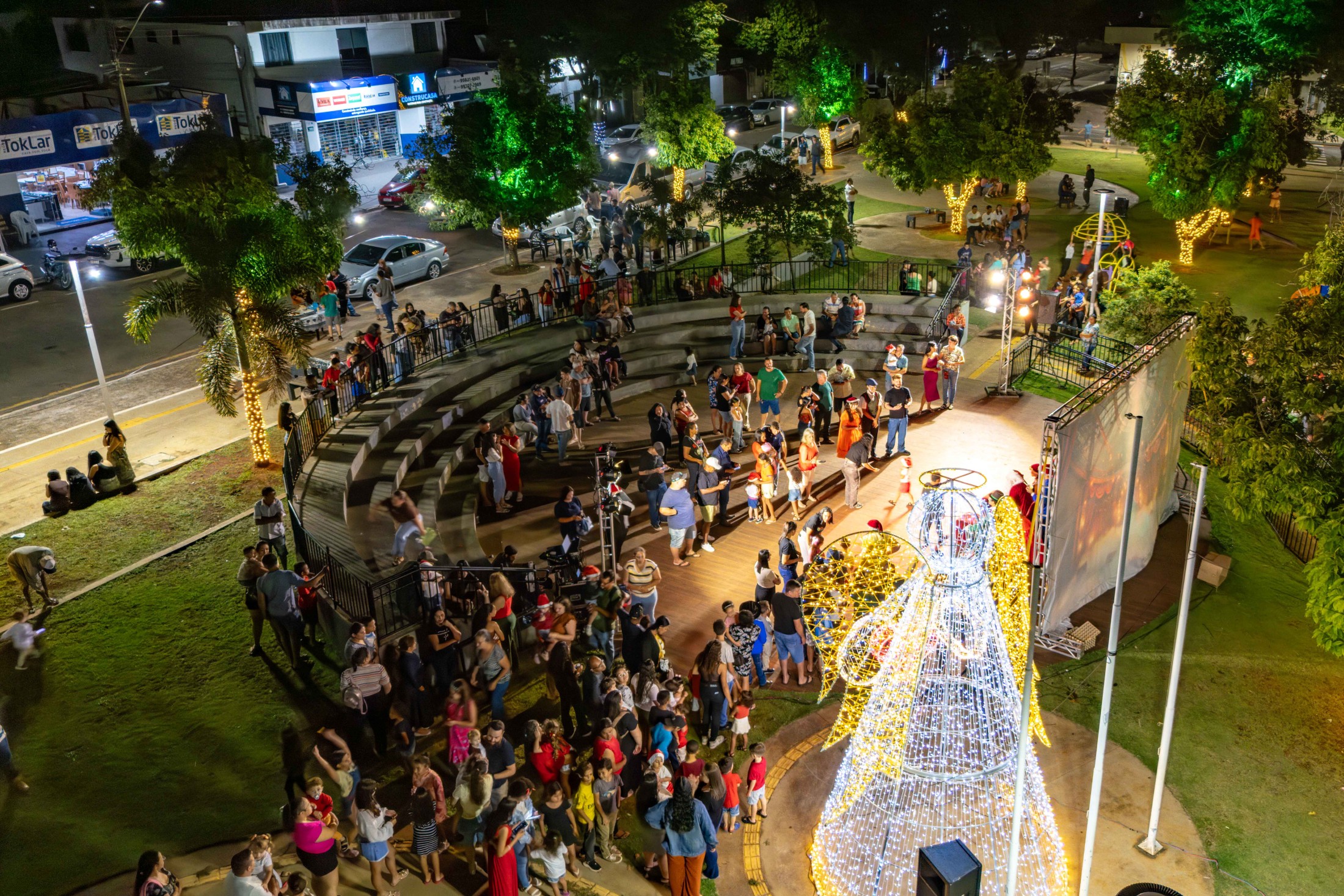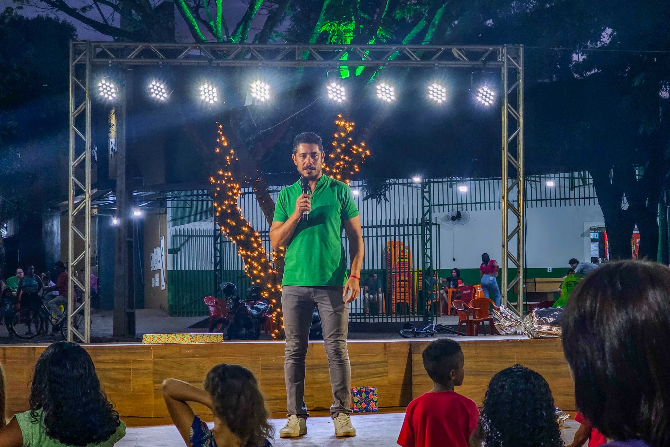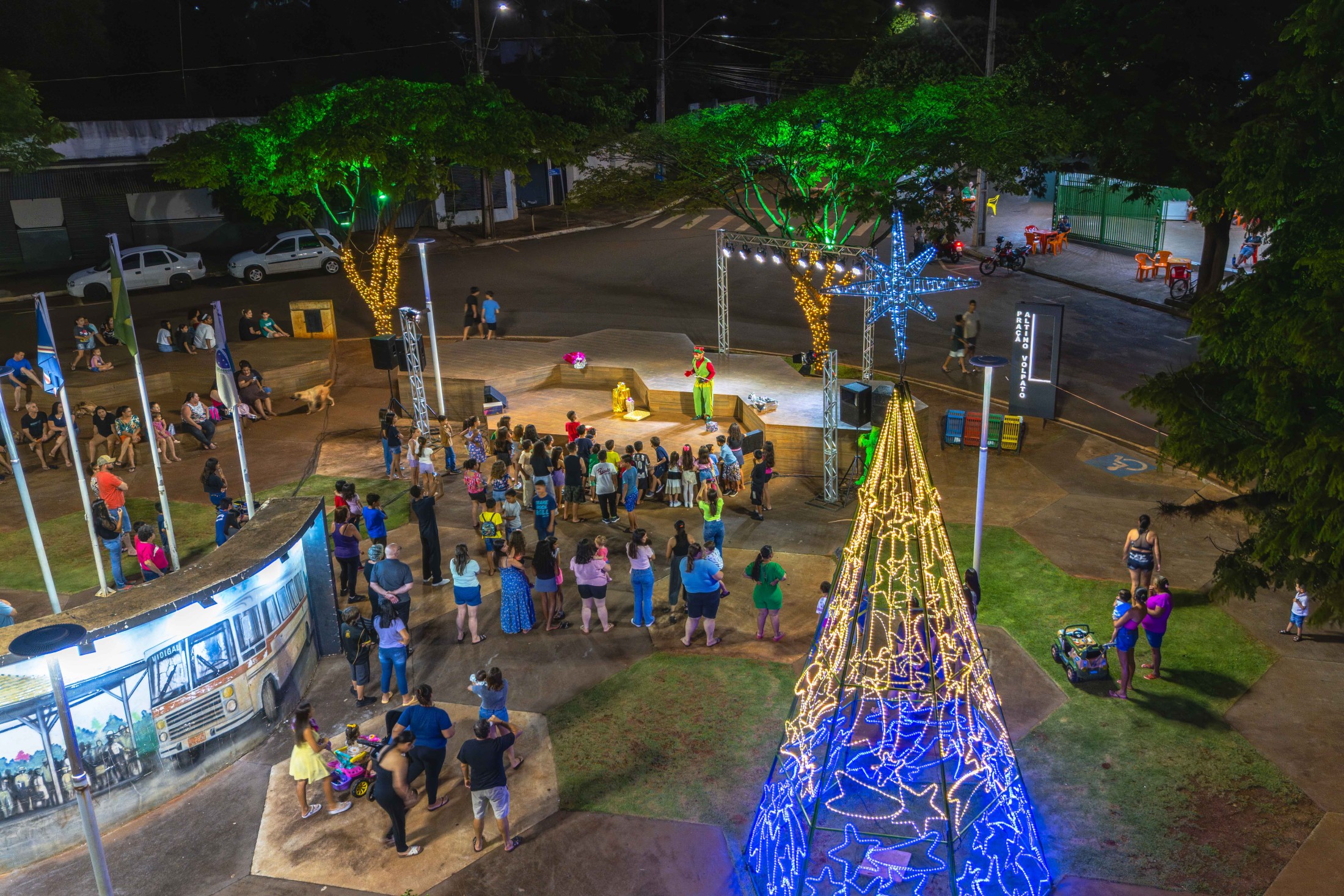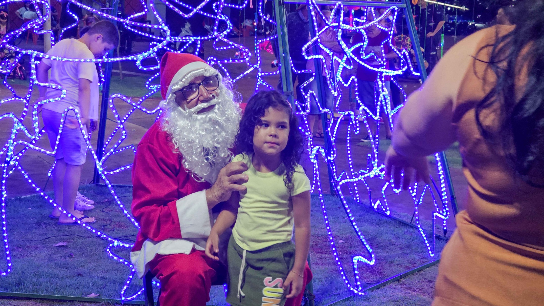 Em Vidigal, a festa estava inicialmente prevista para a segunda-feira (15), mas as condições climáticas forçaram o adiamento. Demonstrando resiliência, a comunidade compareceu em peso na quarta-feira (17) à Praça Altino Volpato. O destaque da noite foi a apresentação da CIA Ruah de Teatro, que encenou a peça “Cadê a magia do Natal?”. O espetáculo lúdico prendeu a atenção de crianças e adultos, preparando o terreno para o momento mais aguardado: o encontro com o Bom Velhinho.