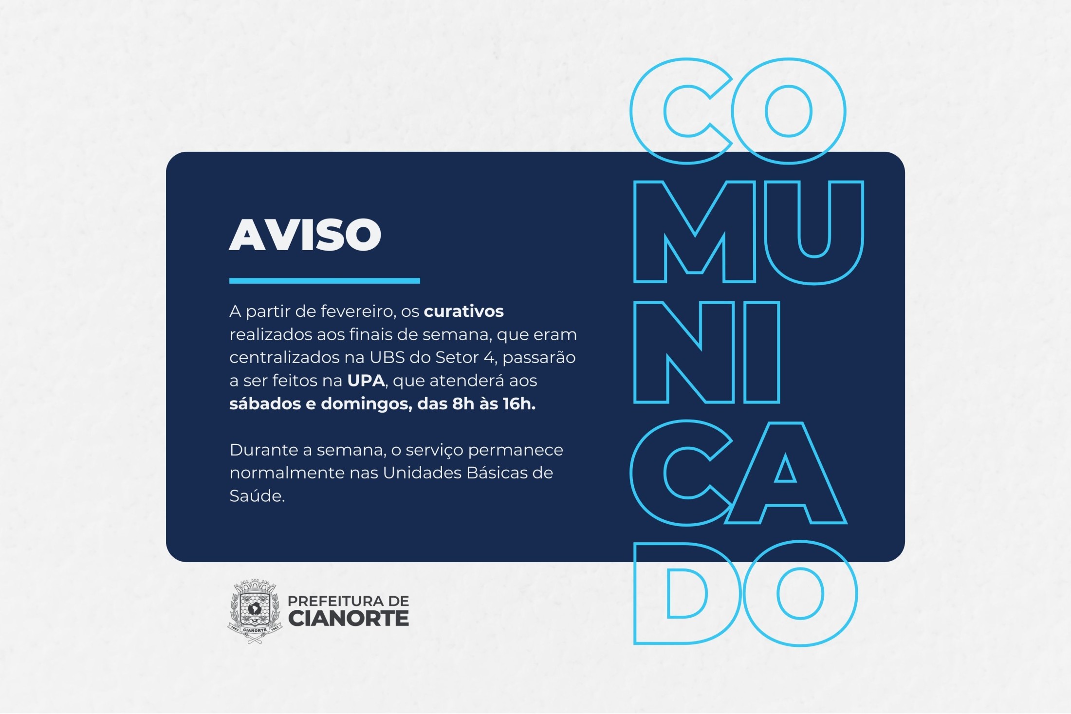 A Secretaria Municipal de Saúde informa que, a partir de fevereiro, os curativos realizados aos finais de semana, até então na UBS do Setor 04, passarão a ser feitos na UPA, que atenderá aos sábados e domingos, no horário das 8h às 16h. Durante a semana, de segunda a sexta-feira, o serviço permanece normalmente nas Unidades Básicas de Saúde.
