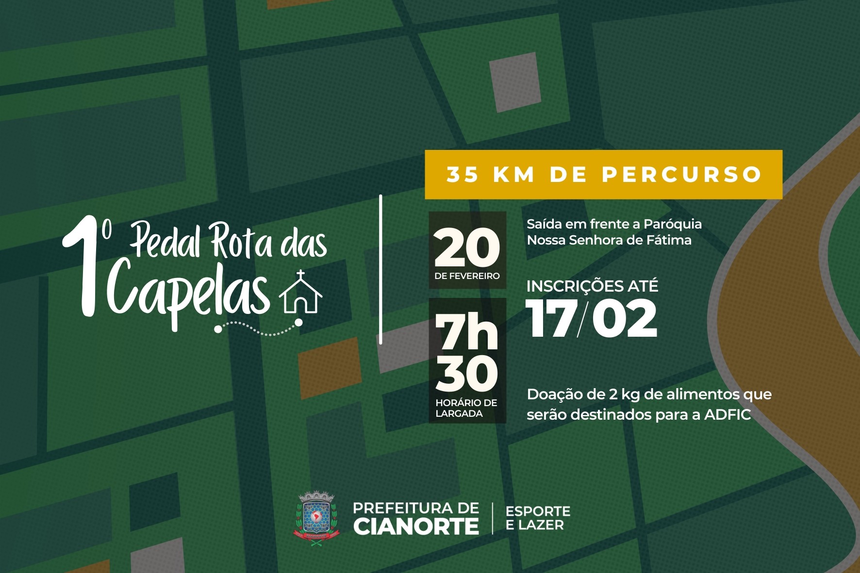 Com largada prevista para 7h30, em frente ao Santuário Eucarístico Nossa Senhora de Fátima, o percurso será de aproximadamente 35 km, com trajeto entre as capelas urbanas e rurais de Cianorte, e retorno ao Santuário. Durante a pedalada, haverá pontos pré-determinados para hidratação e, ao final, serão entregues medalhas, com sorteio de brindes aos participantes. Em todo o percurso, é necessário o uso de equipamentos de segurança.