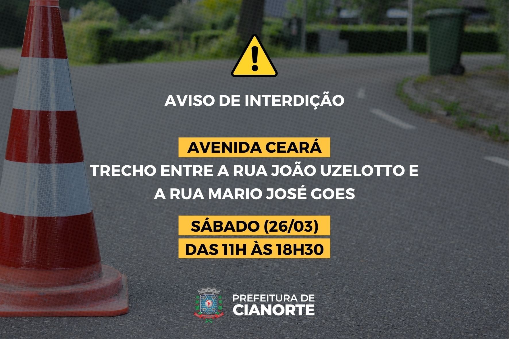 A Diretoria de Trânsito (Diretran) informa sobre uma interdição temporária na Avenida Ceará, no trecho entre a Rua João Uzelotto e a Rua Mario José Goes, para a realização do projeto Rua de Lazer no bairro Residencial Aquiles Cômar, neste sábado (26/03).