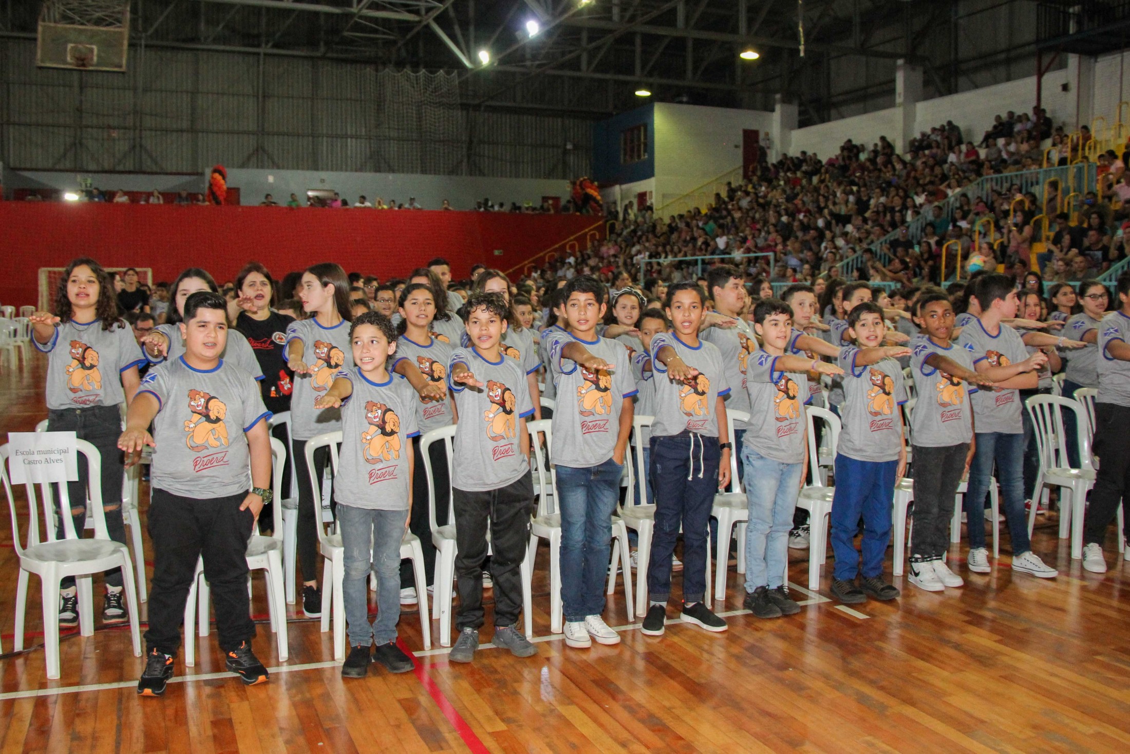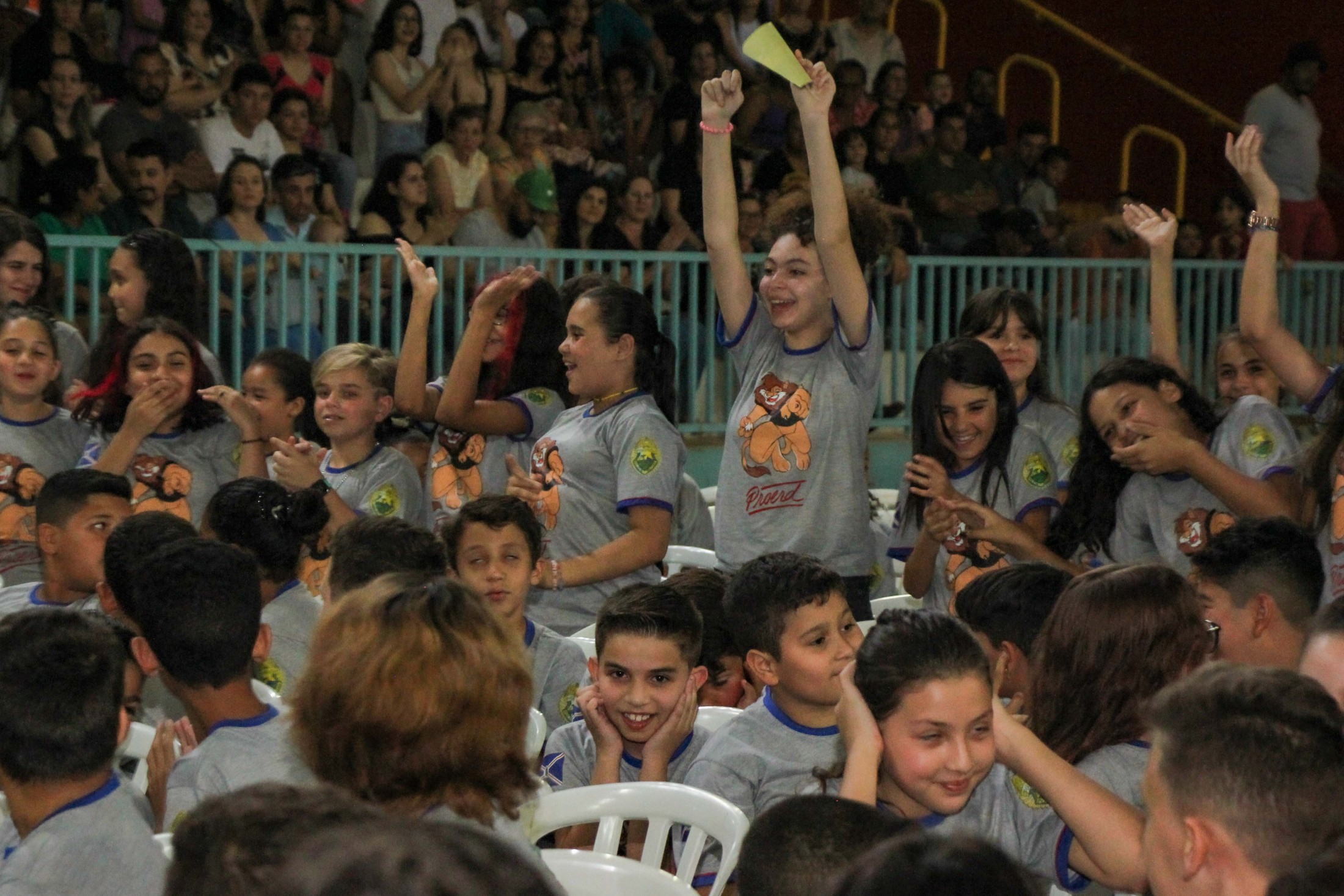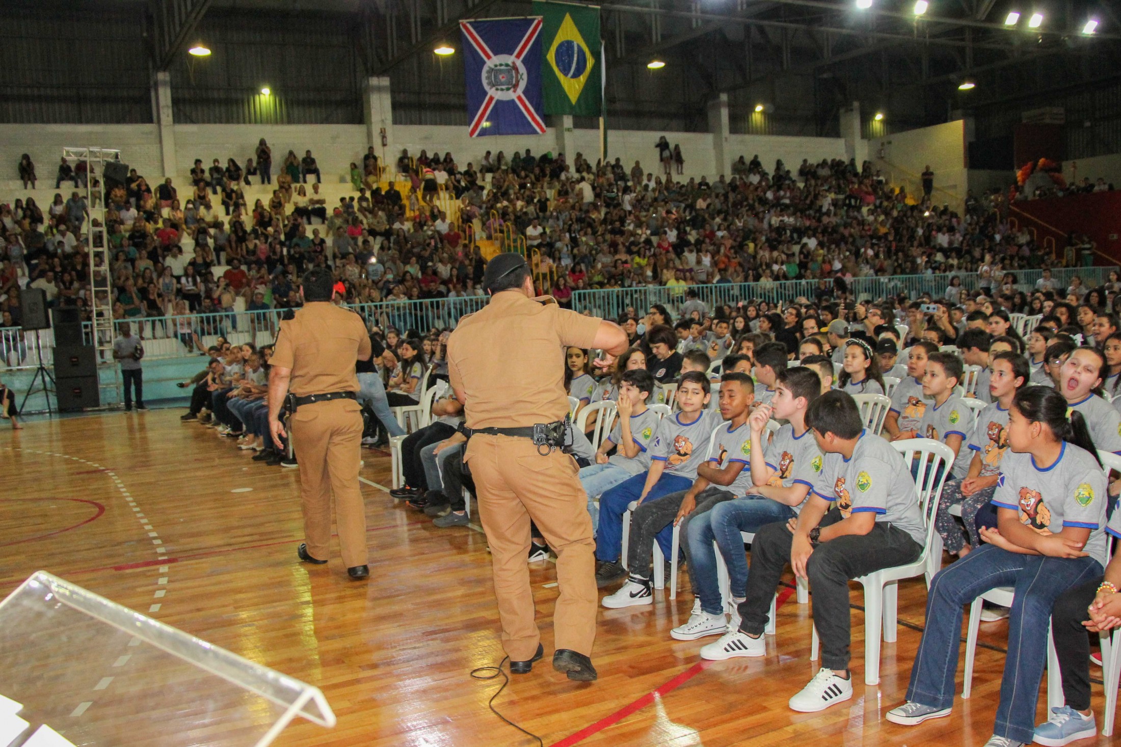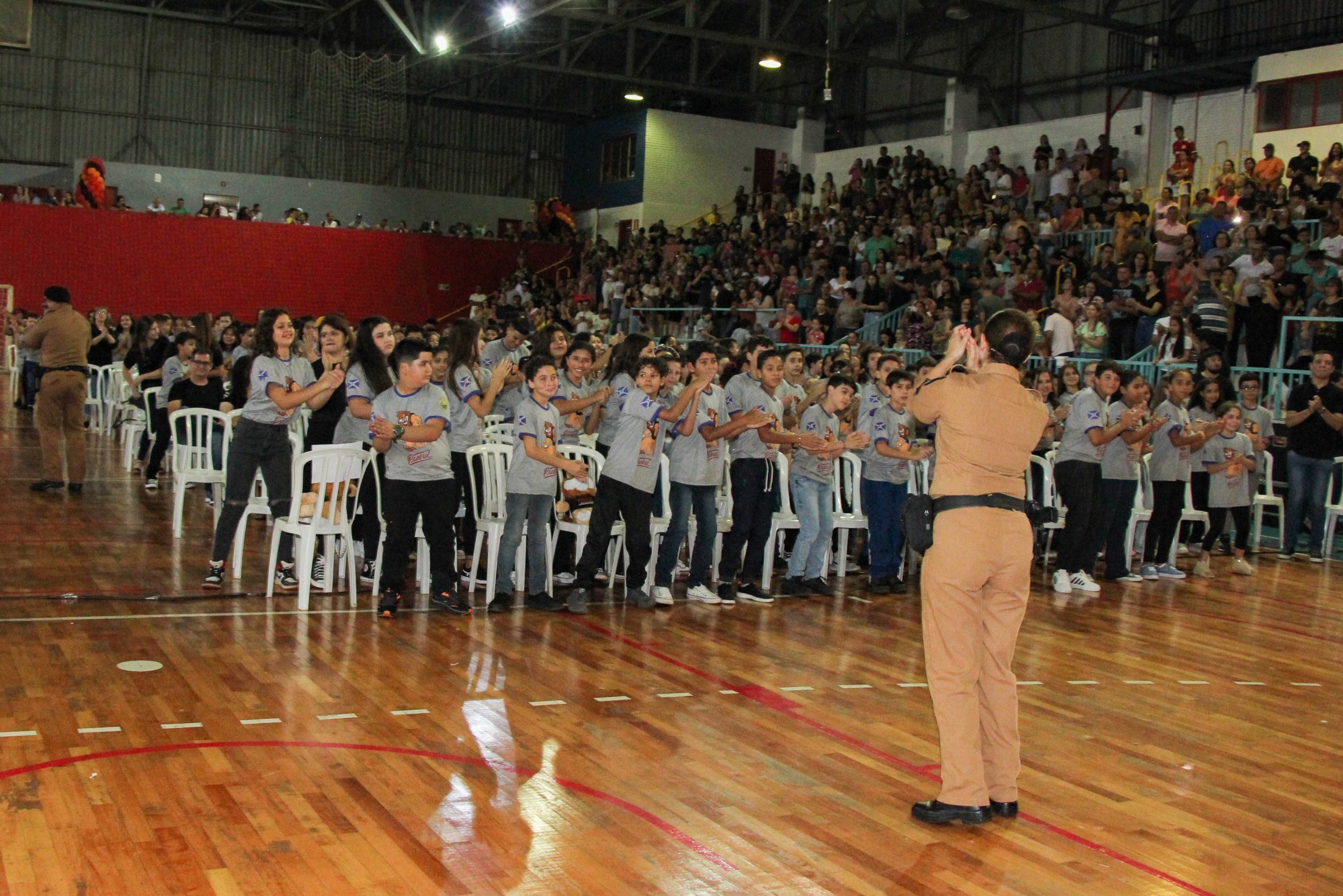 Emoção e alegria marcaram a solenidade de formatura do Programa Educacional de Resistência às Drogas e à Violência – Proerd, realizada na noite da última quinta-feira (10), no Ginásio de Esportes Tancredo Neves (Tancredão). O evento reuniu cerca de 3 mil pessoas, entre autoridades, militares, profissionais da educação, familiares e, aproximadamente, 670 estudantes do 5º ano do Ensino Fundamental, das 13 escolas da rede municipal de ensino, participantes do programa.
