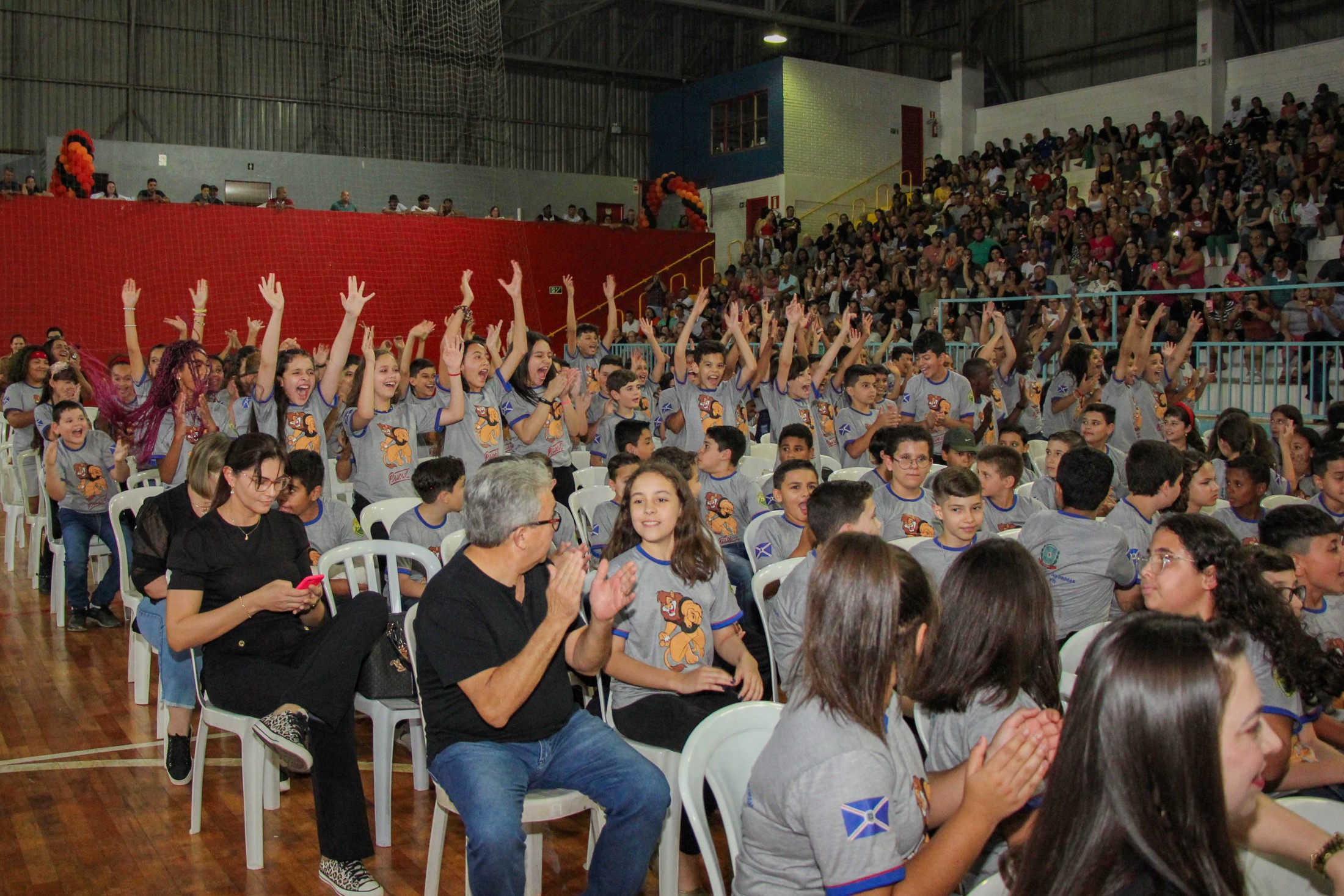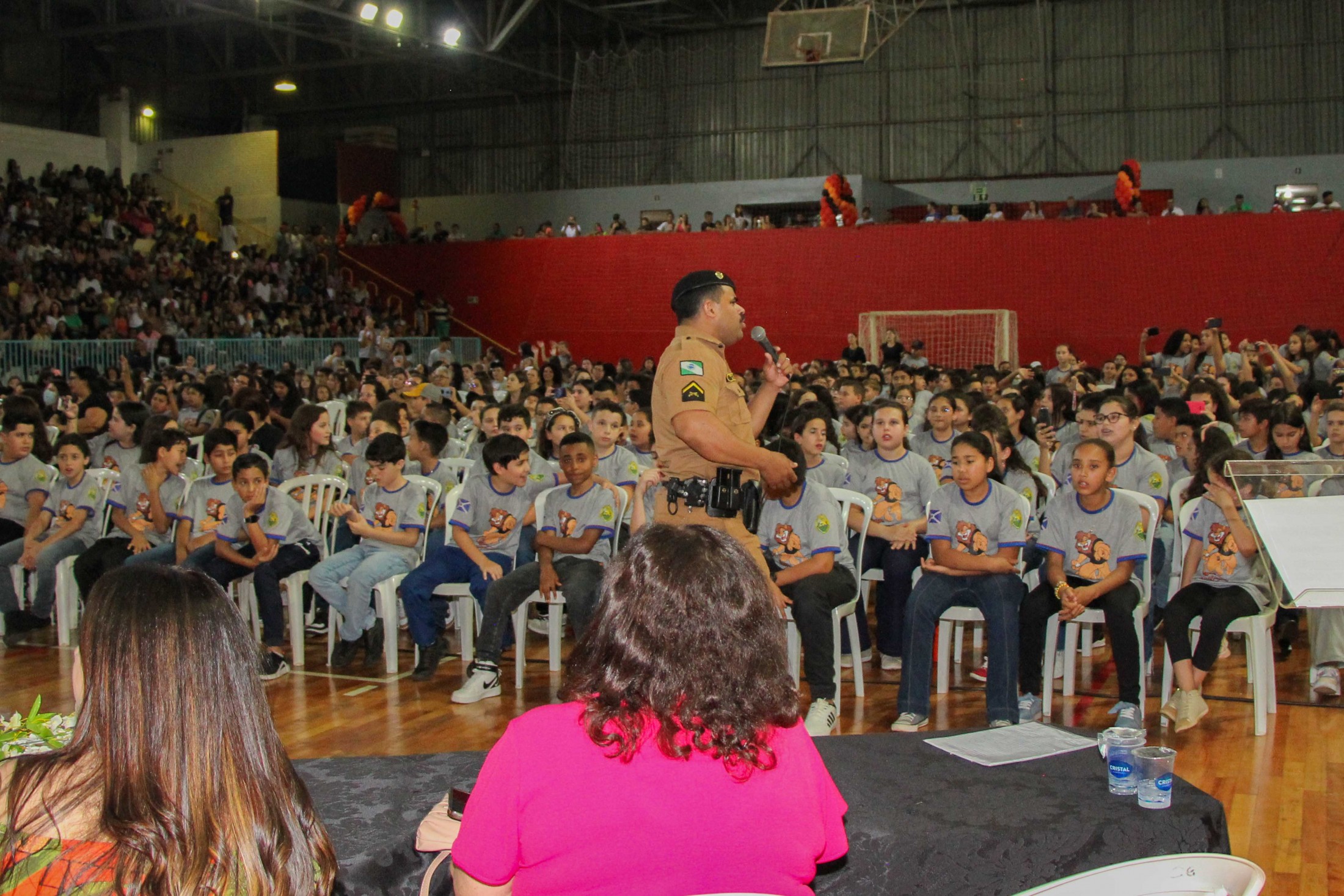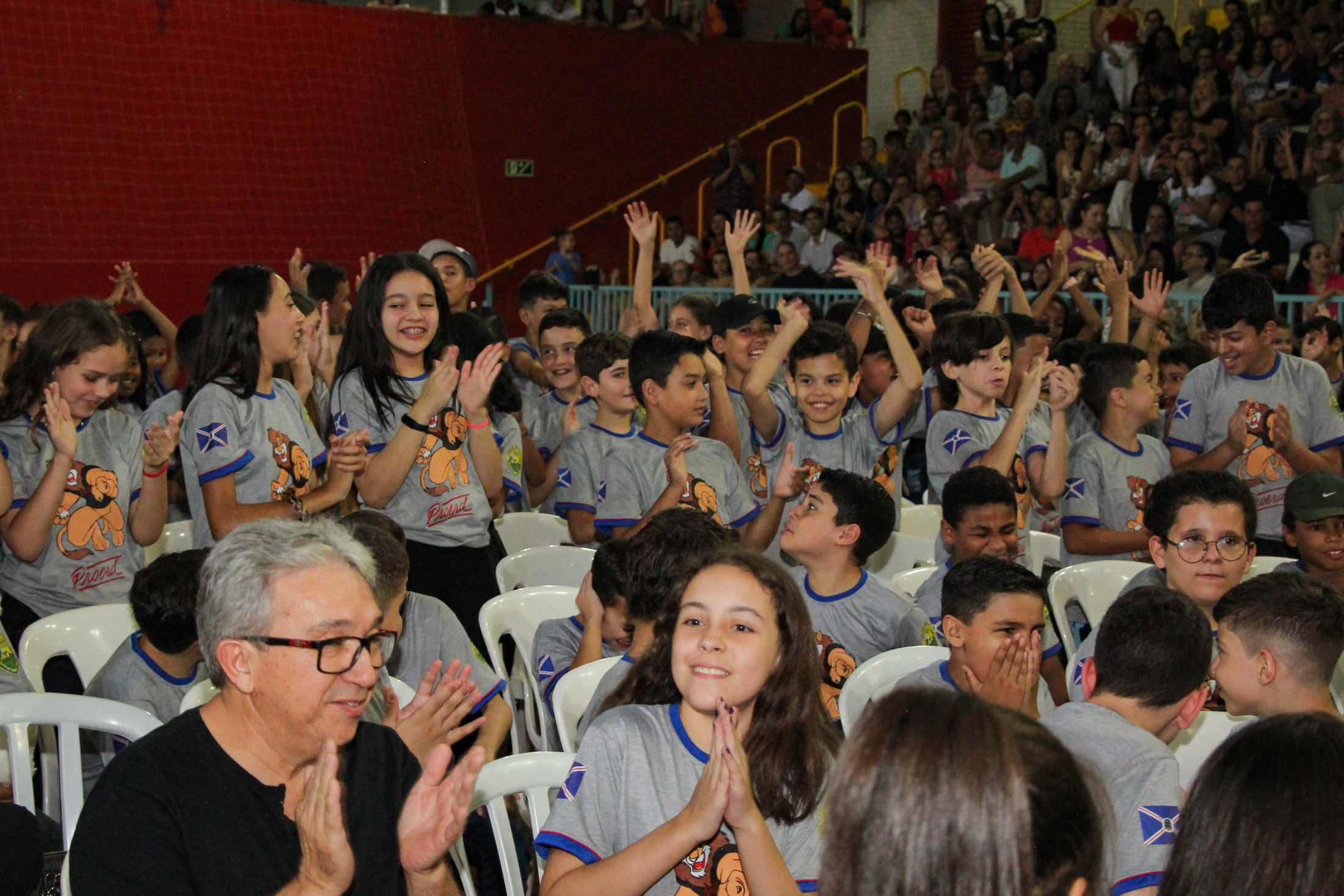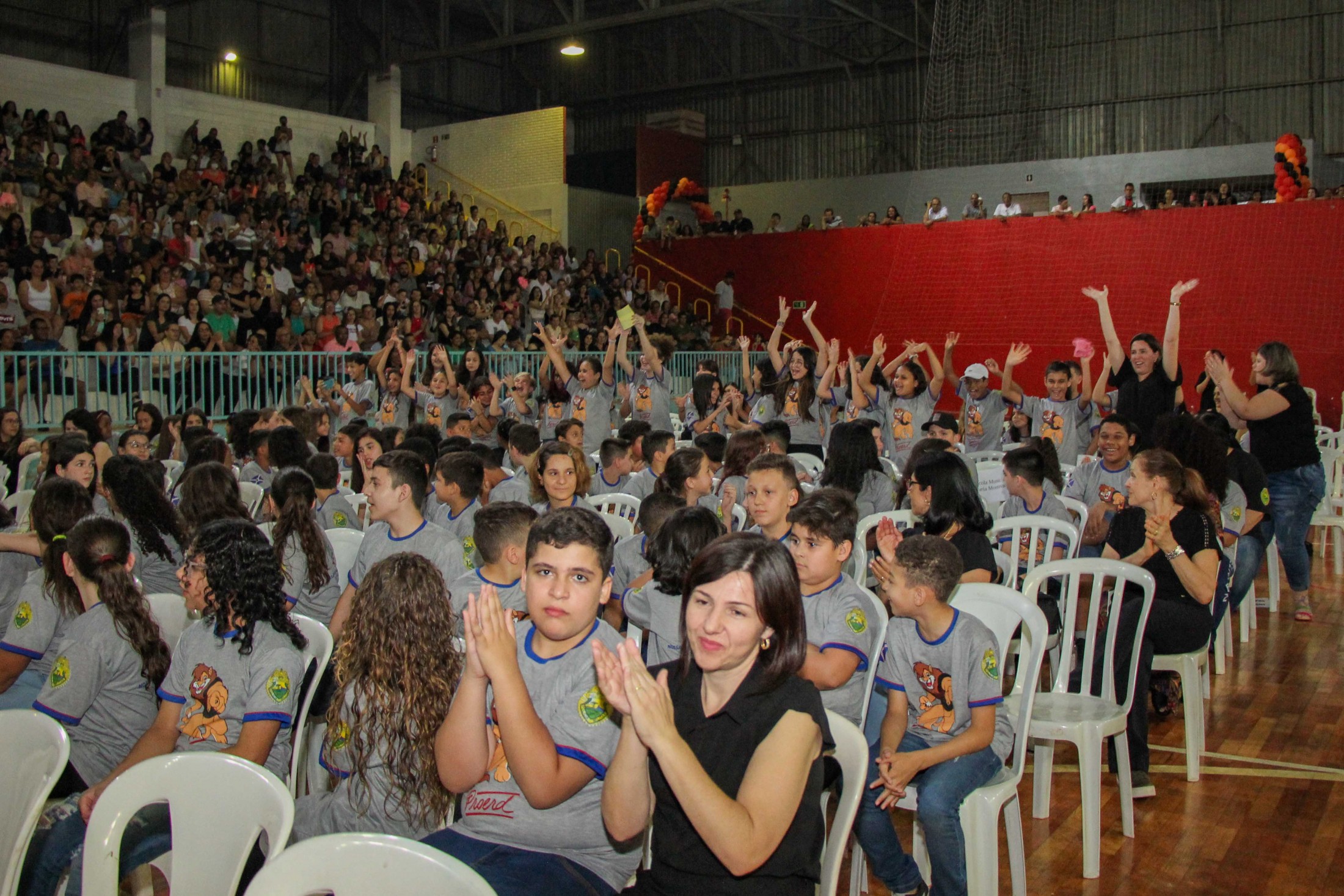 Emoção e alegria marcaram a solenidade de formatura do Programa Educacional de Resistência às Drogas e à Violência – Proerd, realizada na noite da última quinta-feira (10), no Ginásio de Esportes Tancredo Neves (Tancredão). O evento reuniu cerca de 3 mil pessoas, entre autoridades, militares, profissionais da educação, familiares e, aproximadamente, 670 estudantes do 5º ano do Ensino Fundamental, das 13 escolas da rede municipal de ensino, participantes do programa.