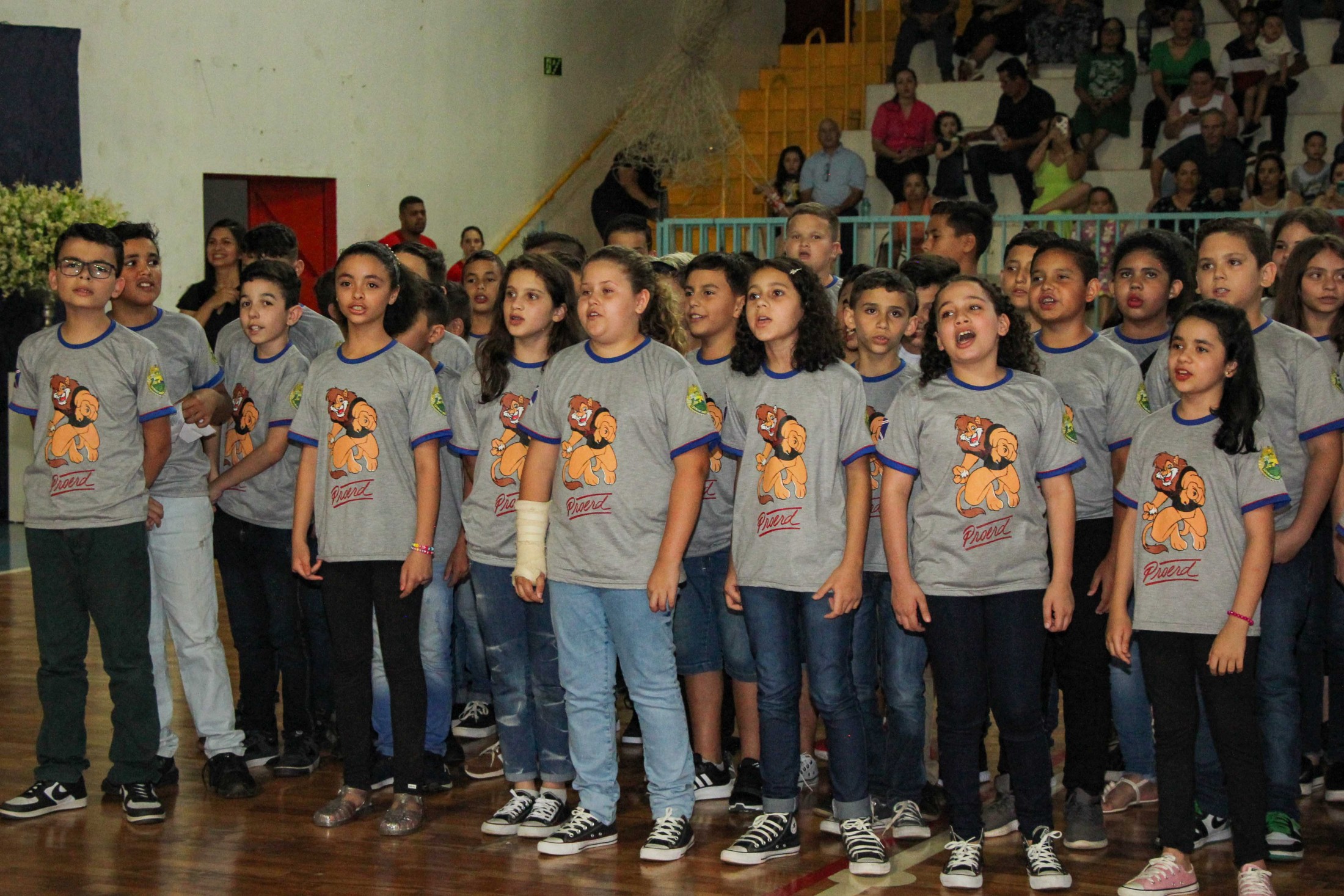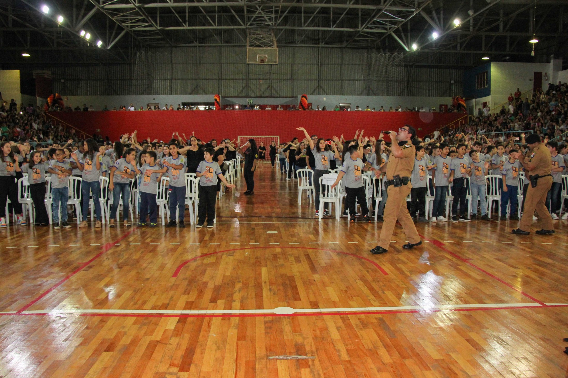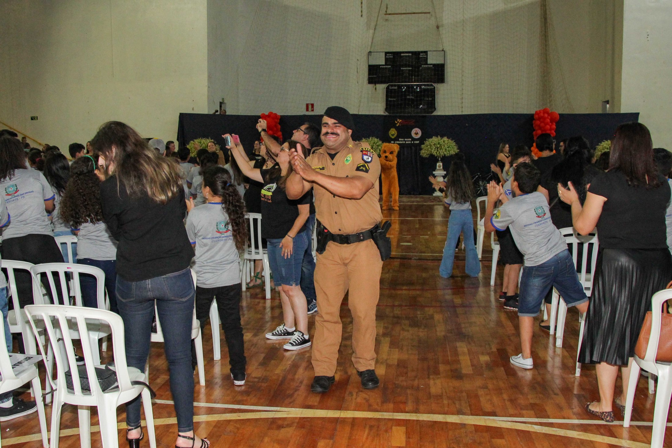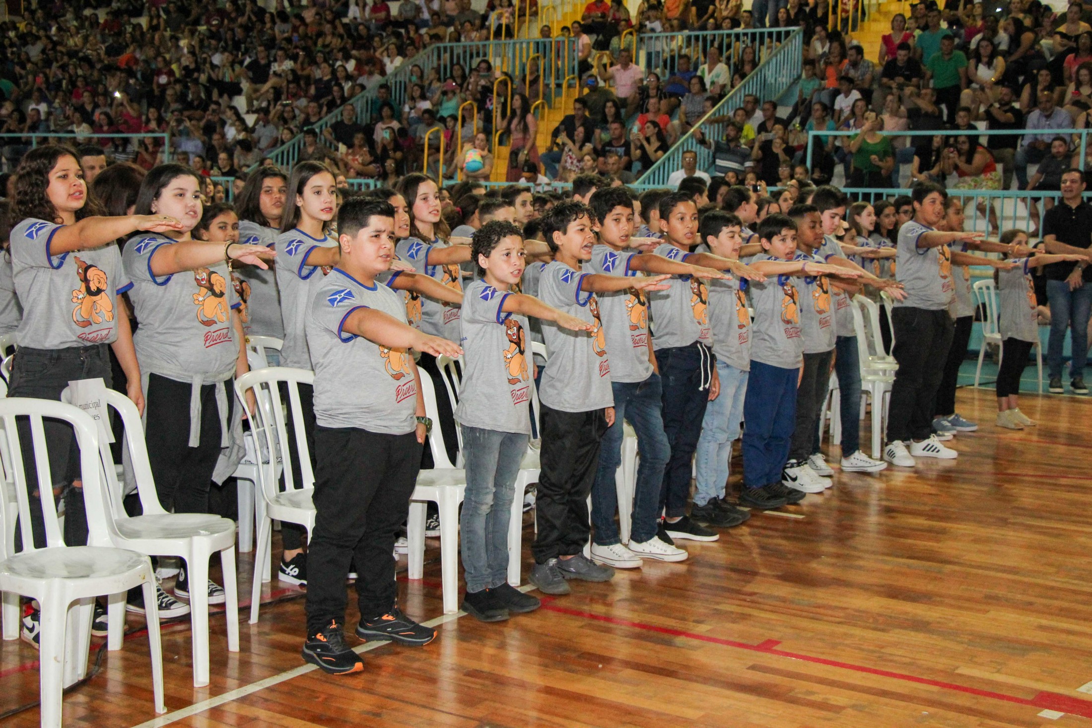 Emoção e alegria marcaram a solenidade de formatura do Programa Educacional de Resistência às Drogas e à Violência – Proerd, realizada na noite da última quinta-feira (10), no Ginásio de Esportes Tancredo Neves (Tancredão). O evento reuniu cerca de 3 mil pessoas, entre autoridades, militares, profissionais da educação, familiares e, aproximadamente, 670 estudantes do 5º ano do Ensino Fundamental, das 13 escolas da rede municipal de ensino, participantes do programa.