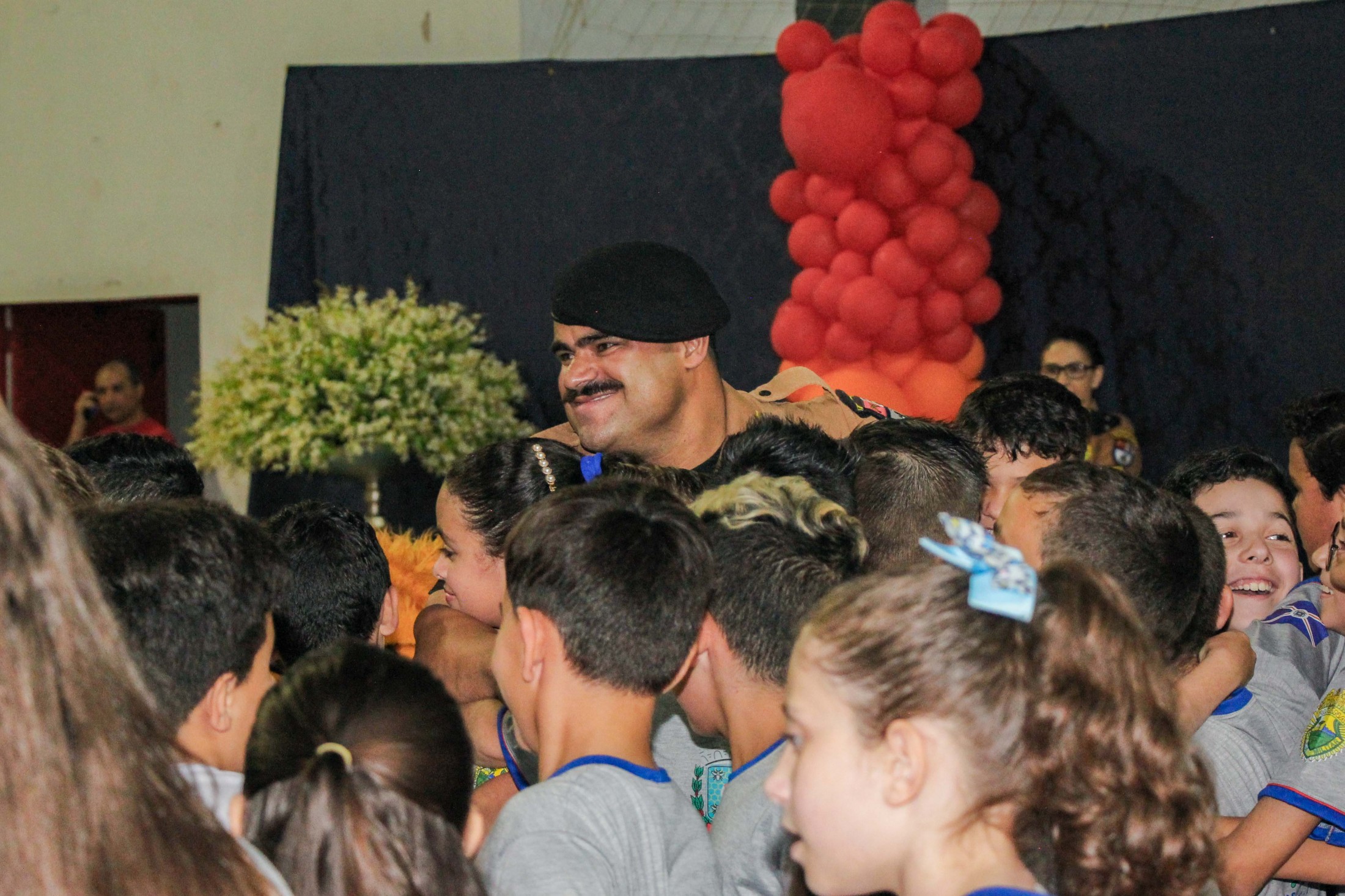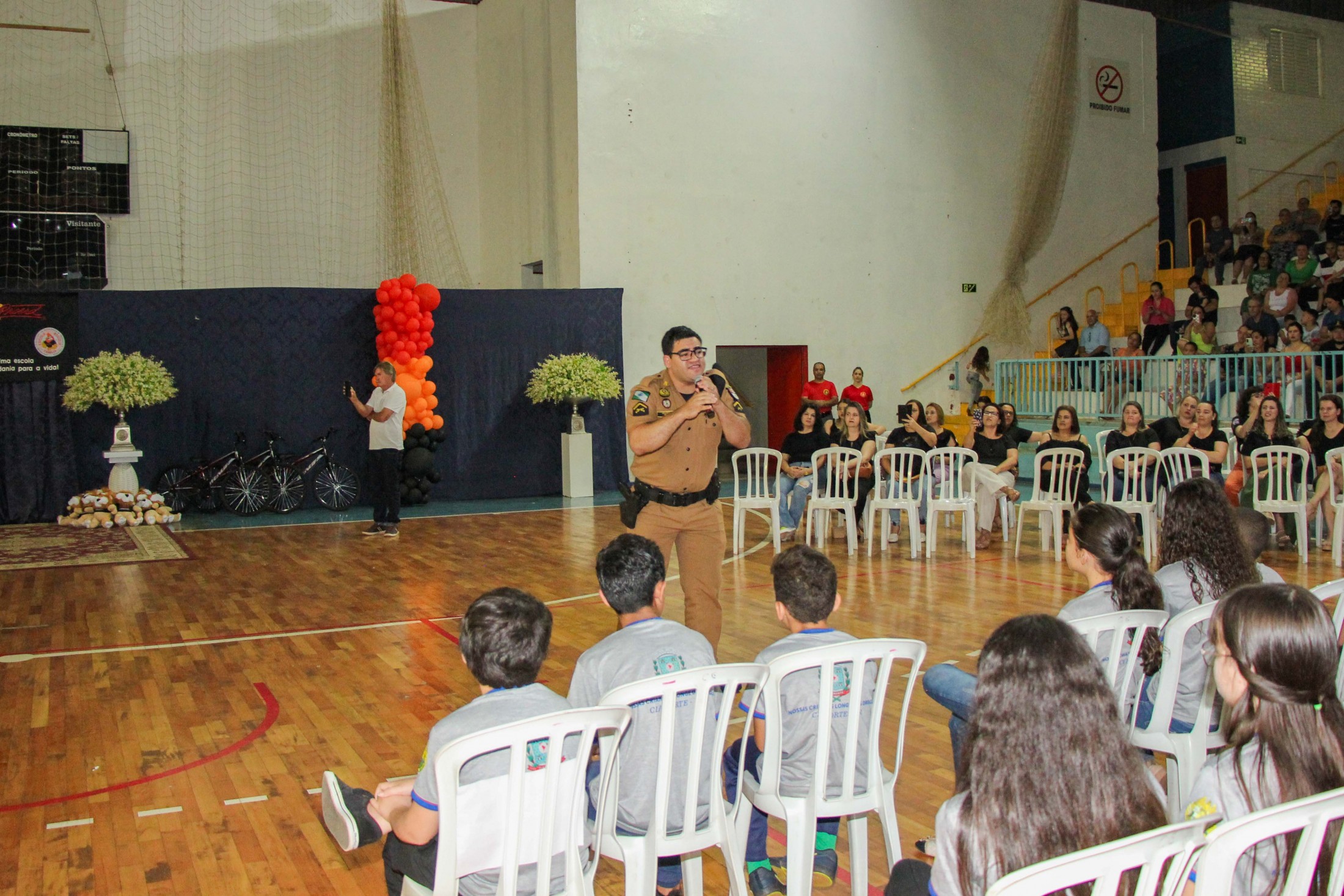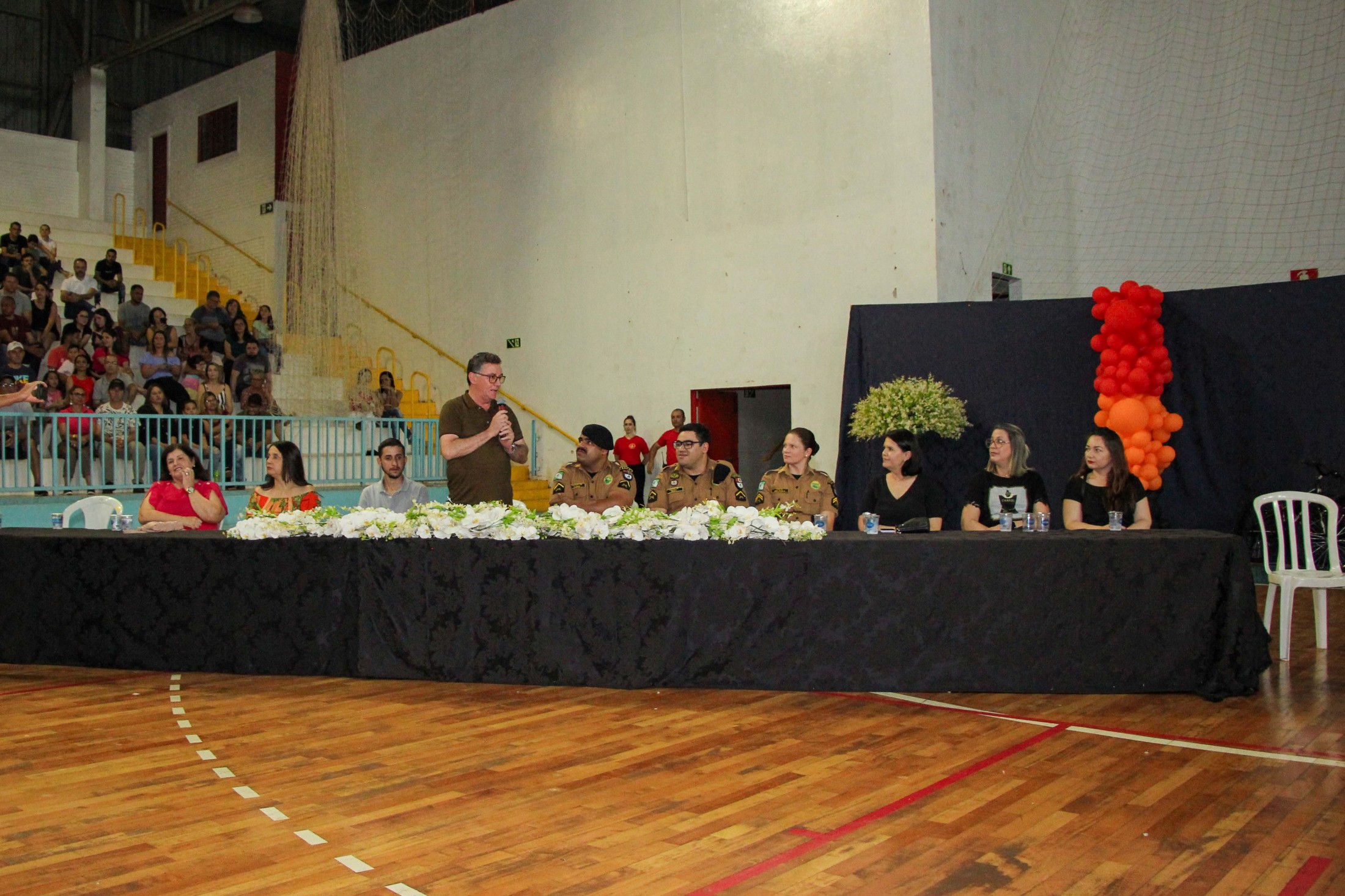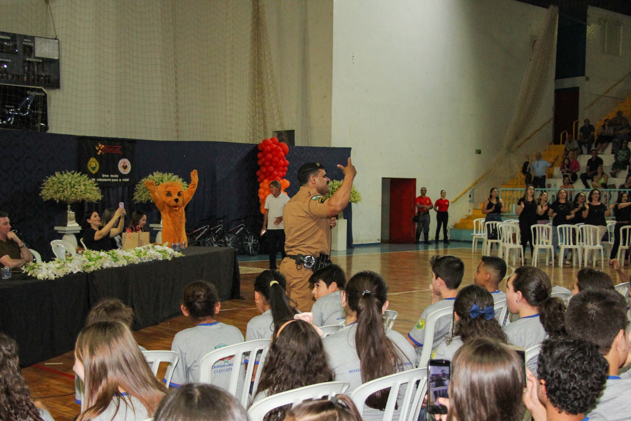 Emoção e alegria marcaram a solenidade de formatura do Programa Educacional de Resistência às Drogas e à Violência – Proerd, realizada na noite da última quinta-feira (10), no Ginásio de Esportes Tancredo Neves (Tancredão). O evento reuniu cerca de 3 mil pessoas, entre autoridades, militares, profissionais da educação, familiares e, aproximadamente, 670 estudantes do 5º ano do Ensino Fundamental, das 13 escolas da rede municipal de ensino, participantes do programa.