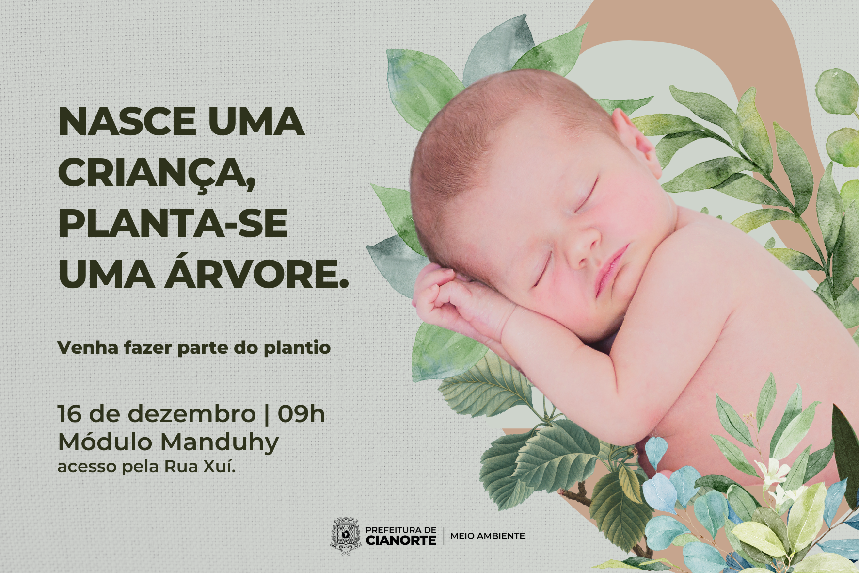 Neste ano, de 1º de janeiro a 02 de dezembro, Cianorte ganhou 876 bebês pela rede pública de saúde. Para homenagear cada nascimento, a Secretaria Municipal de Meio Ambiente e Bem-Estar Animal promove, nesta sexta-feira (16), o plantio de mudas de árvores nativas em número igual ao das crianças. Toda população, em especial os pais, está convidada a participar da ocasião, marcada para as 9h, no Módulo Manduhy, com entrada pela Rua Xuí.