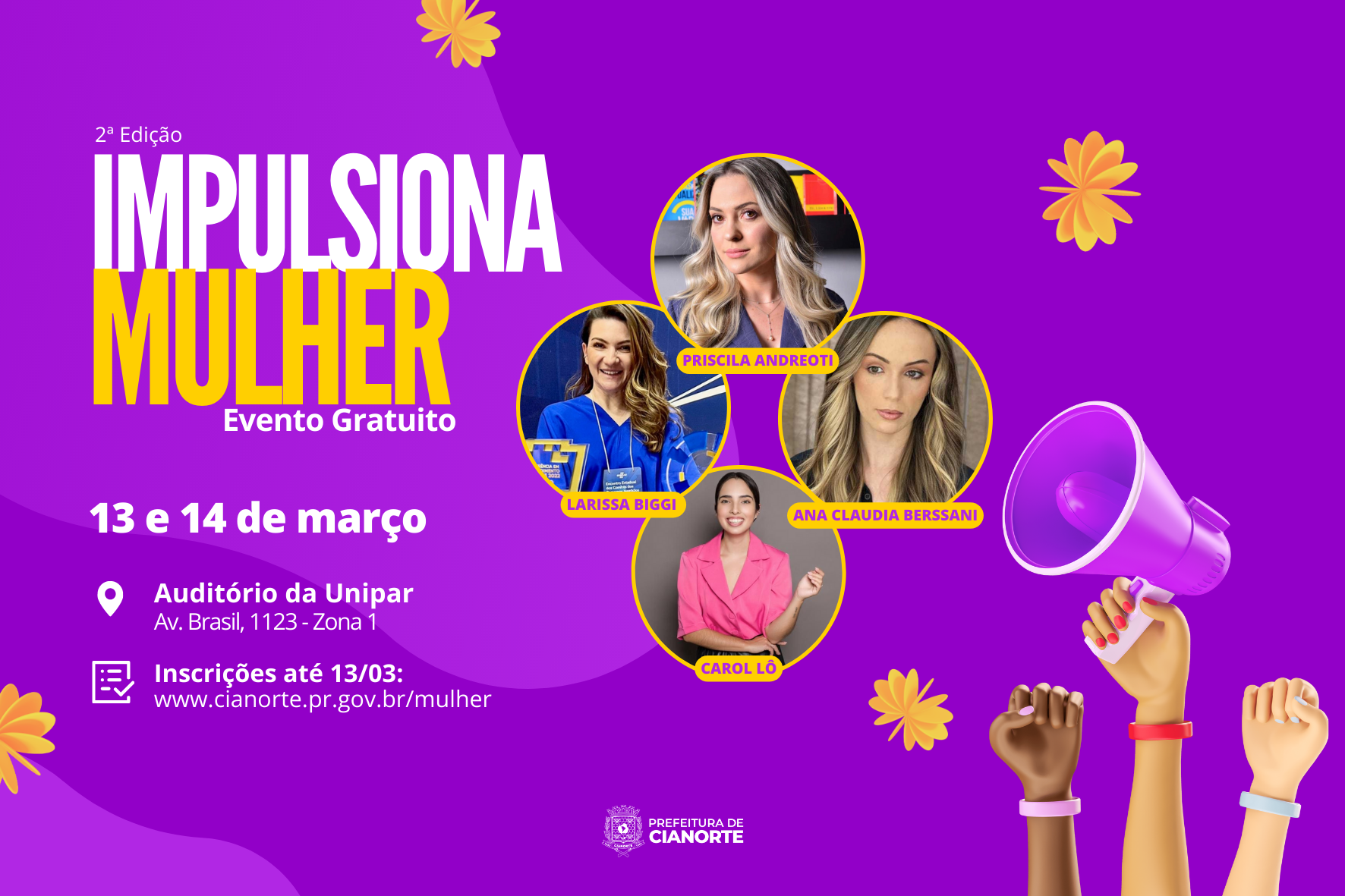 As inscrições são gratuitas e podem ser realizadas até o primeiro dia de evento, acessando o banner rotativo disponível no site da Prefeitura (www.cianorte.pr.gov.br) ou diretamente pelo link https://forms.gle/6LBYjSGcrM9WQdB17. A promoção é da Prefeitura de Cianorte, por meio das secretarias de Fazenda, de Desenvolvimento Econômico (Casa do Empreendedor) e de Políticas Públicas para Mulheres, Crianças e Adolescentes, em parceria com a Unipar.