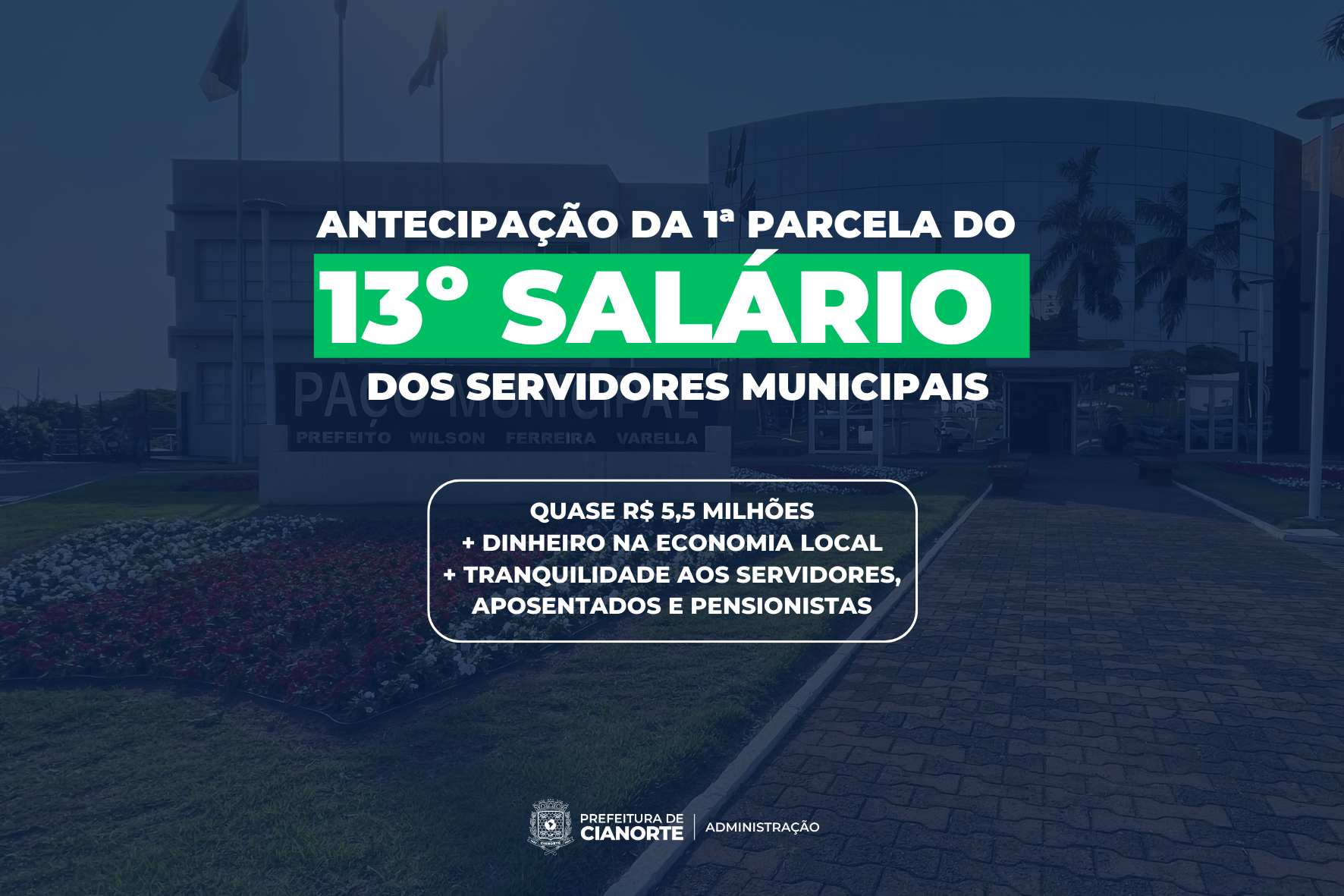 Instituído em 1962, o 13º salário representa para o empregado brasileiro um alívio no orçamento doméstico e, por isso, é aguardado com expectativa. Por lei, todo empregador tem até o dia 30 de novembro para realizar o pagamento da primeira parcela. Em Cianorte, apesar do prazo, a administração municipal mais uma vez adiantará a gratificação. Nesta quarta-feira (10), os servidores ativos, bem como os beneficiários da Capseci, recebem o correspondente a 40% da remuneração extra.