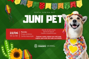 A Secretaria Municipal de Meio Ambiente e Bem-Estar Animal prepara uma festança que promete momentos de alegria e confraternização entre tutores e pets. Trata-se da Juni Pet, a primeira festa junina pet, que será realizada no dia 22 de junho (sábado), das 16h às 18h, no Parcão (Praça Antônio Carlos Assunção).