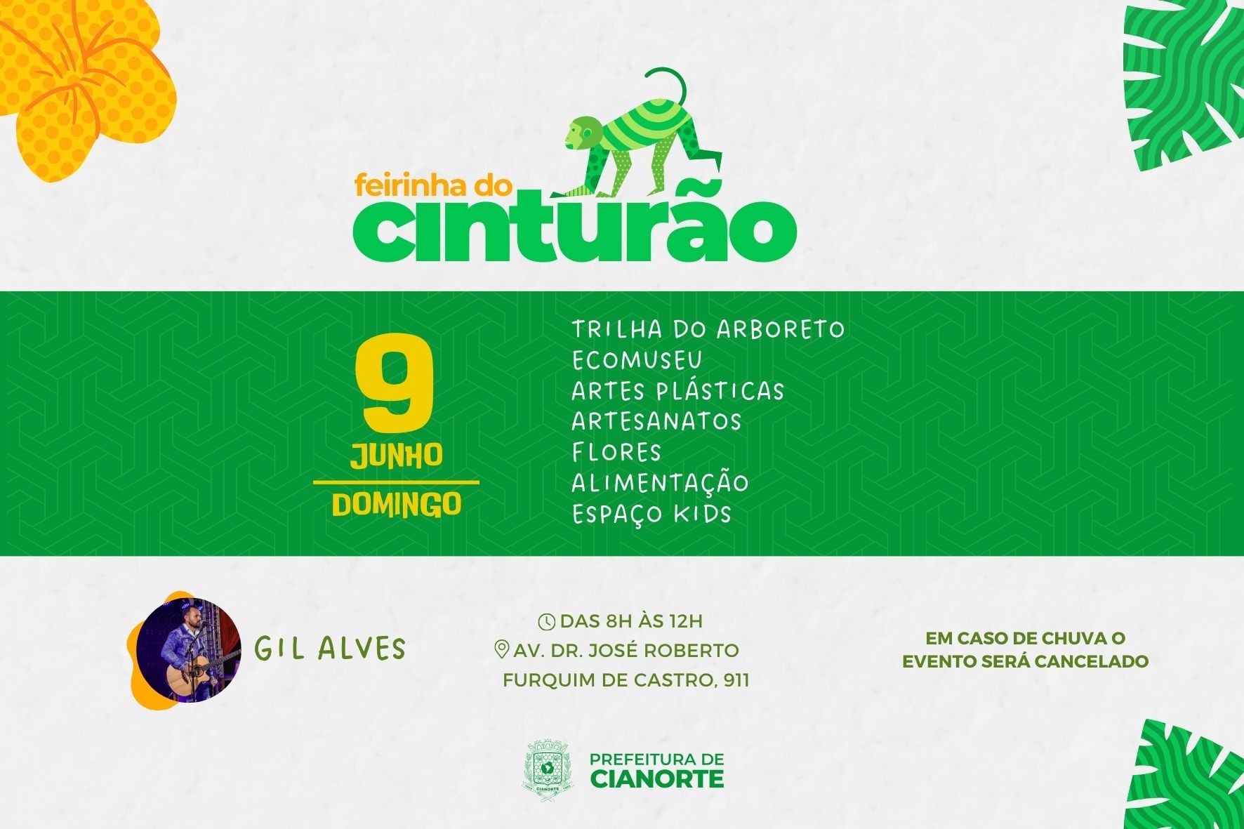 “A Feirinha do Cinturão é uma oportunidade imperdível para apreciar o Parque Municipal Cinturão Verde em meio a uma atmosfera descontraída e cheia de boas energias”, garante o secretário municipal de Cultura, Evandro de Castro. Por conta da iniciativa, das 8h às 14h, haverá interdição parcial na Avenida Dr. José Roberto Furquim de Castro, nas proximidades do Ecomuseu. Em caso de chuva, o evento será cancelado.