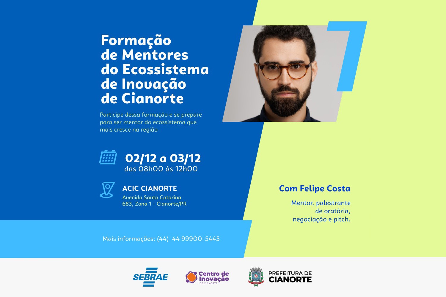 Já estão abertas as inscrições para a Formação e Desenvolvimento de Mentores para atuação junto ao ecossistema de inovação, no apoio a projetos e negócios inovadores e startups, com o instrutor Felipe Costa. A capacitação será nos dias 02 e 03 de dezembro (segunda e terça-feira), das 8h às 12h, na sala grande de reunião da Associação Comercial e Empresarial de Cianorte – ACIC.