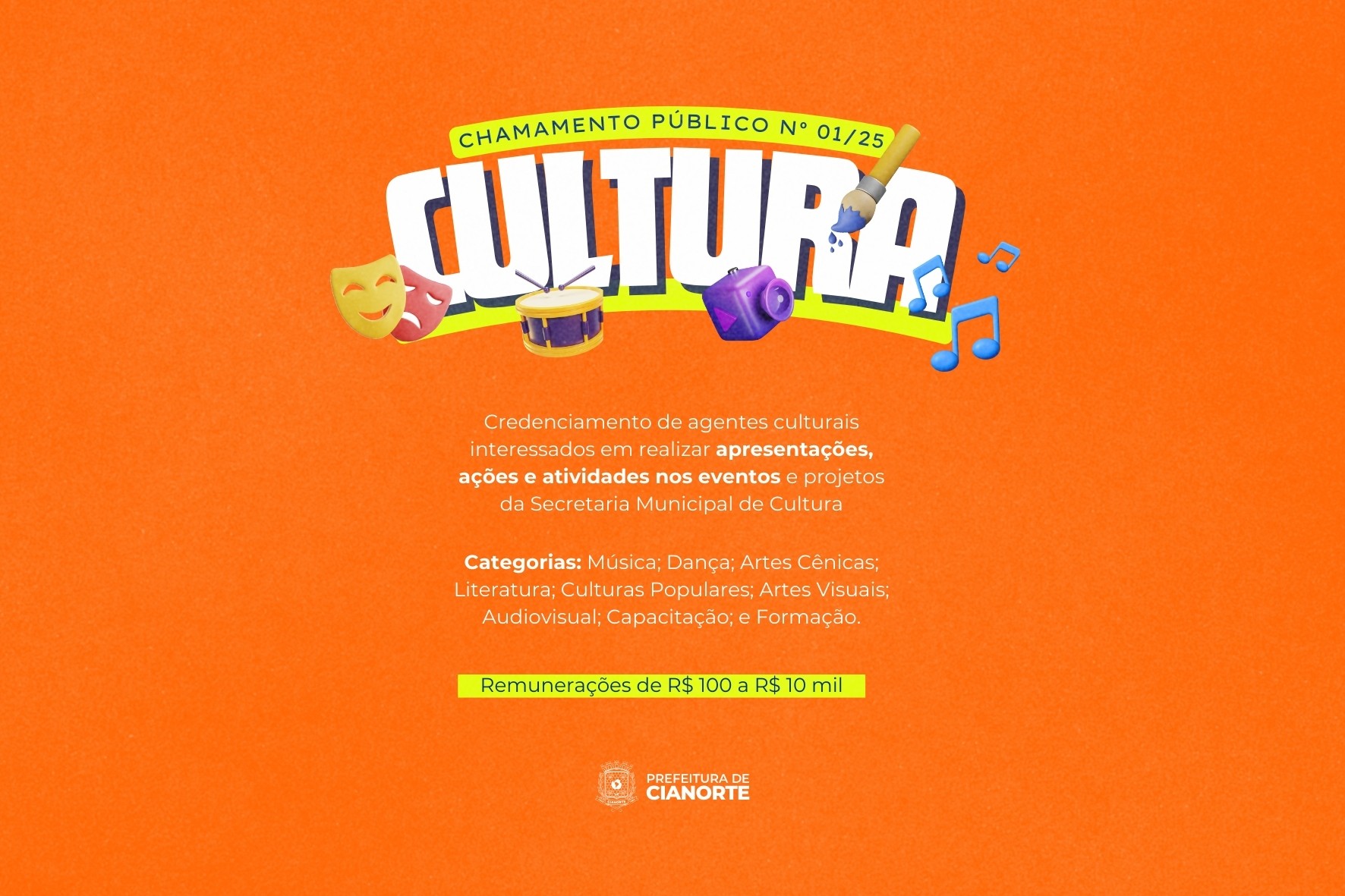 “Este credenciamento atende às diretrizes da recém-criada Lei Federal nº 14.903/2024, intitulada como Marco Regulatório da Cultura. A nova legislação organiza as regras das políticas de Fomento à Cultura, a partir de um ponto de vista técnico e democrático, com um regime jurídico próprio, e cria procedimentos mais inclusos, que retiram os obstáculos e reduzem as desigualdades de acesso às políticas culturais”, explicou o secretário da pasta, Evandro de Castro. O Chamamento Público nº 01/2025 pode ser consultado no Portal da Transparência do Município ou diretamente pelo link https://www.cianorte.pr.gov.br/edital/?idCategoriaEdital=5.