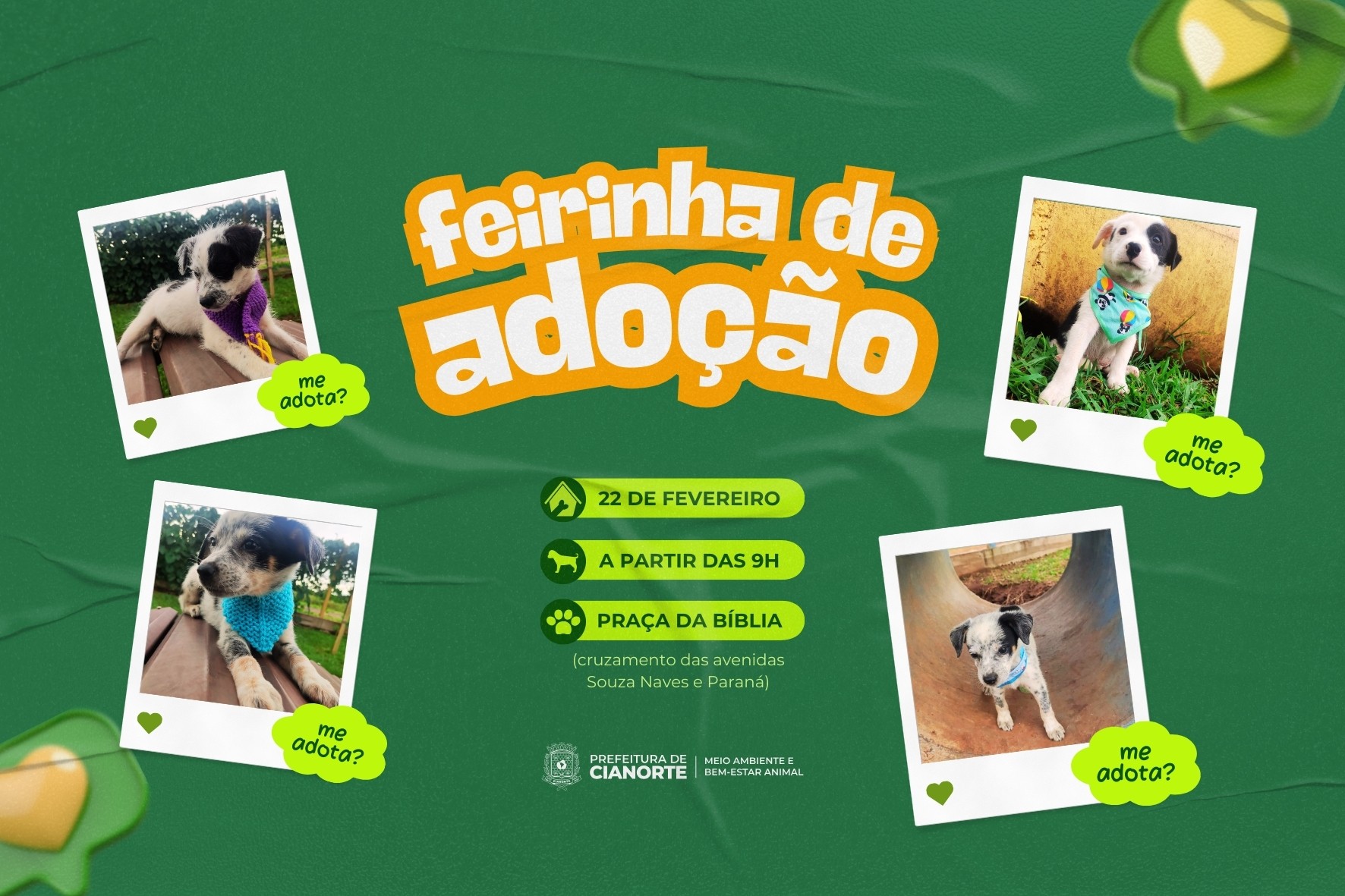 Quem está a procura de um amigo de patas tem a oportunidade de encontrar na tradicional Feirinha de Adoção do Canil Municipal que, neste sábado (22), será realizada na Praça da Bíblia (cruzamento das avenidas Souza Naves e Paraná), das 9h às 12h, com nove cachorros, entre filhotes e adultos.