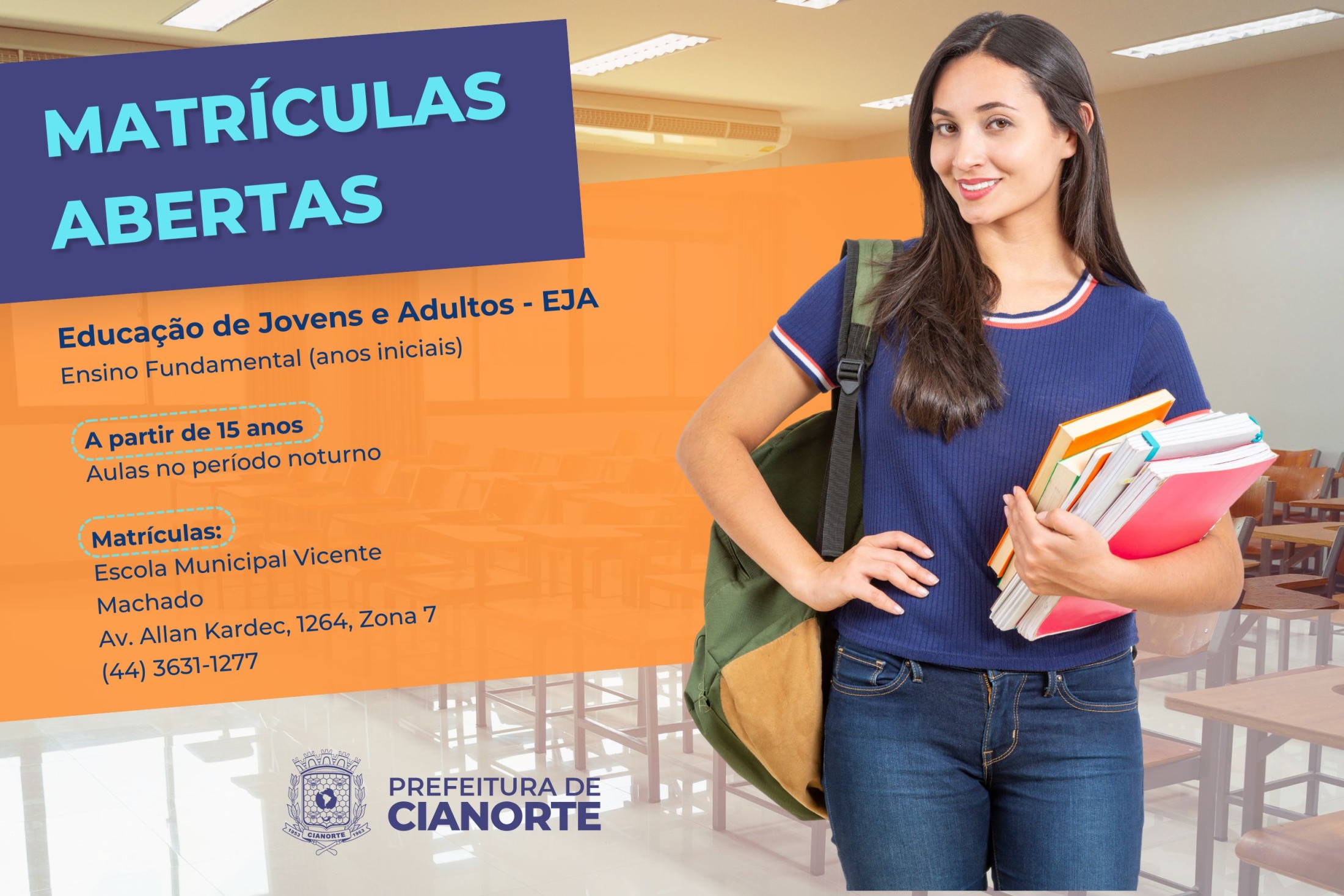 Em Cianorte, as pessoas com idade a partir dos 15 anos que desejam concluir os anos iniciais do Ensino Fundamental (do 1º ao 5º) têm a oportunidade na Educação de Jovens e Adultos (EJA), que está com as matrículas abertas. O ensino é gratuito, com aulas no período noturno. Os interessados devem comparecer à secretaria da Escola Municipal Vicente Machado, na Avenida Allan Kardec, 1264, em frente a Paróquia Sagrado Coração de Jesus, na Zona 07. O atendimento é de segunda a sexta-feira, das 7h30 às 11h30 e das 13h30 às 17h30.