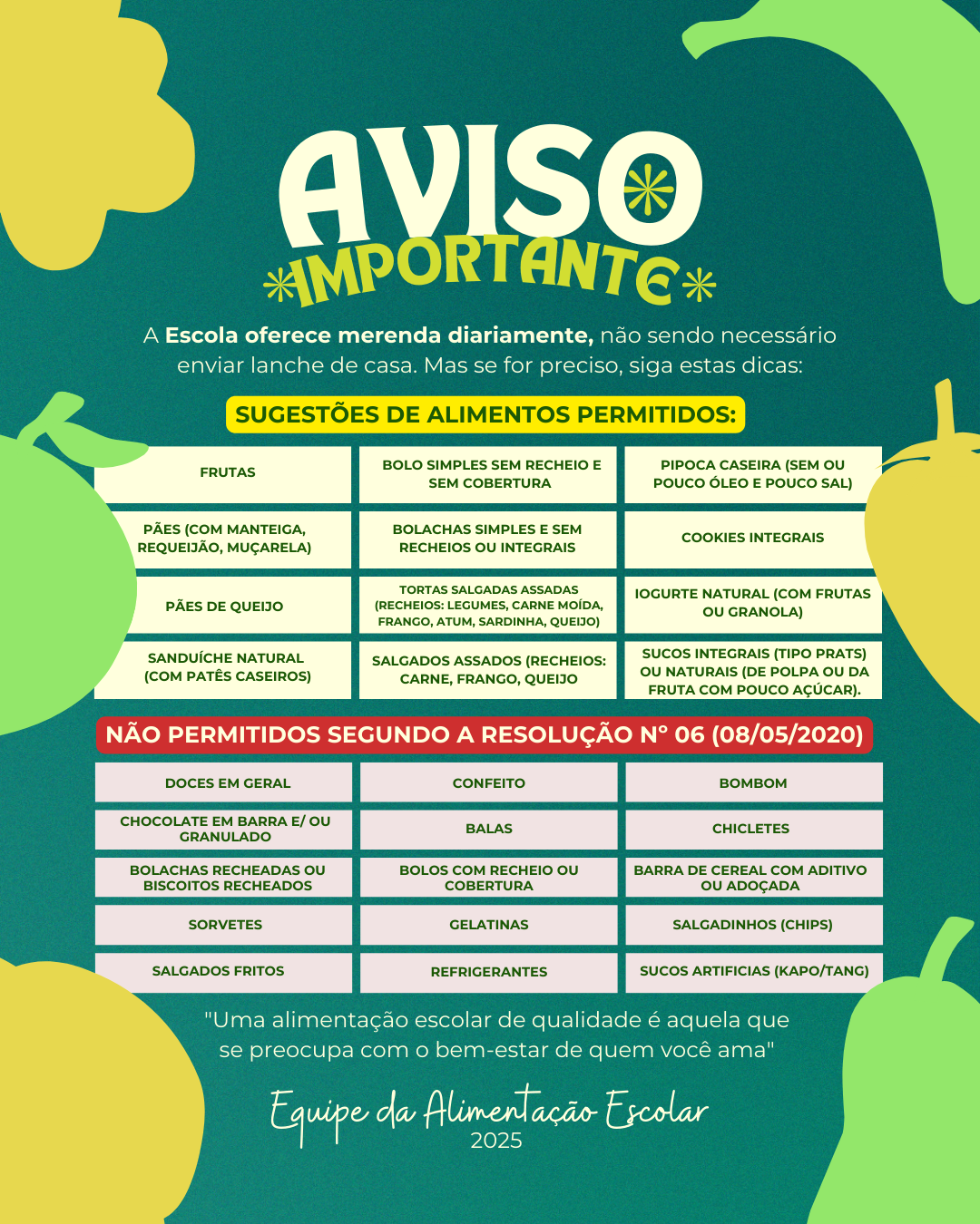 Apesar da dedicação da equipe da Alimentação Escolar, nas escolas municipais é comum que crianças levem o lanche de casa, muitas vezes opções prejudiciais à saúde e, até mesmo, proibidas. “Temos visto estudantes com doces, bolachas recheadas, chips, refrigerantes, chocolates e outras opções que não são permitidas, conforme a Resolução do FNDE nº 06/2020. Por isso, fazemos um alerta aos pais e responsáveis para que fiquem atentos e procurem opções nutritivas e equilibradas”, afirmou a nutricionista, Fabiana Garcia Igarashi.