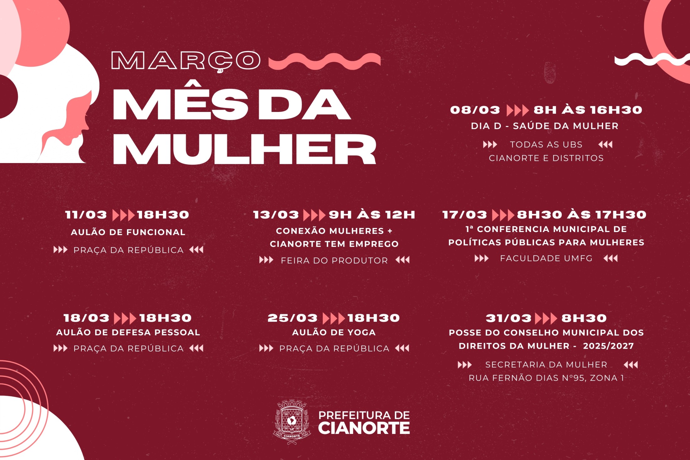 No dia 13 (quinta-feira), o público poderá prestigiar o Conexão Mulheres e o Cianorte Tem Emprego Edição Mulher, das 9h às 12h, na Praça Itamar Orlando Soares (Feira do Produtor). Estão previstas orientações a respeito da Lei Maria da Penha; entrevistas de emprego e encaminhamentos para vagas; distribuição gratuita de absorventes íntimos higiênicos; serviços do Banco da Mulher Paranaense, da Defensoria Pública do Estado do Paraná, da Delegacia da Mulher, universidades, entre outras instituições.