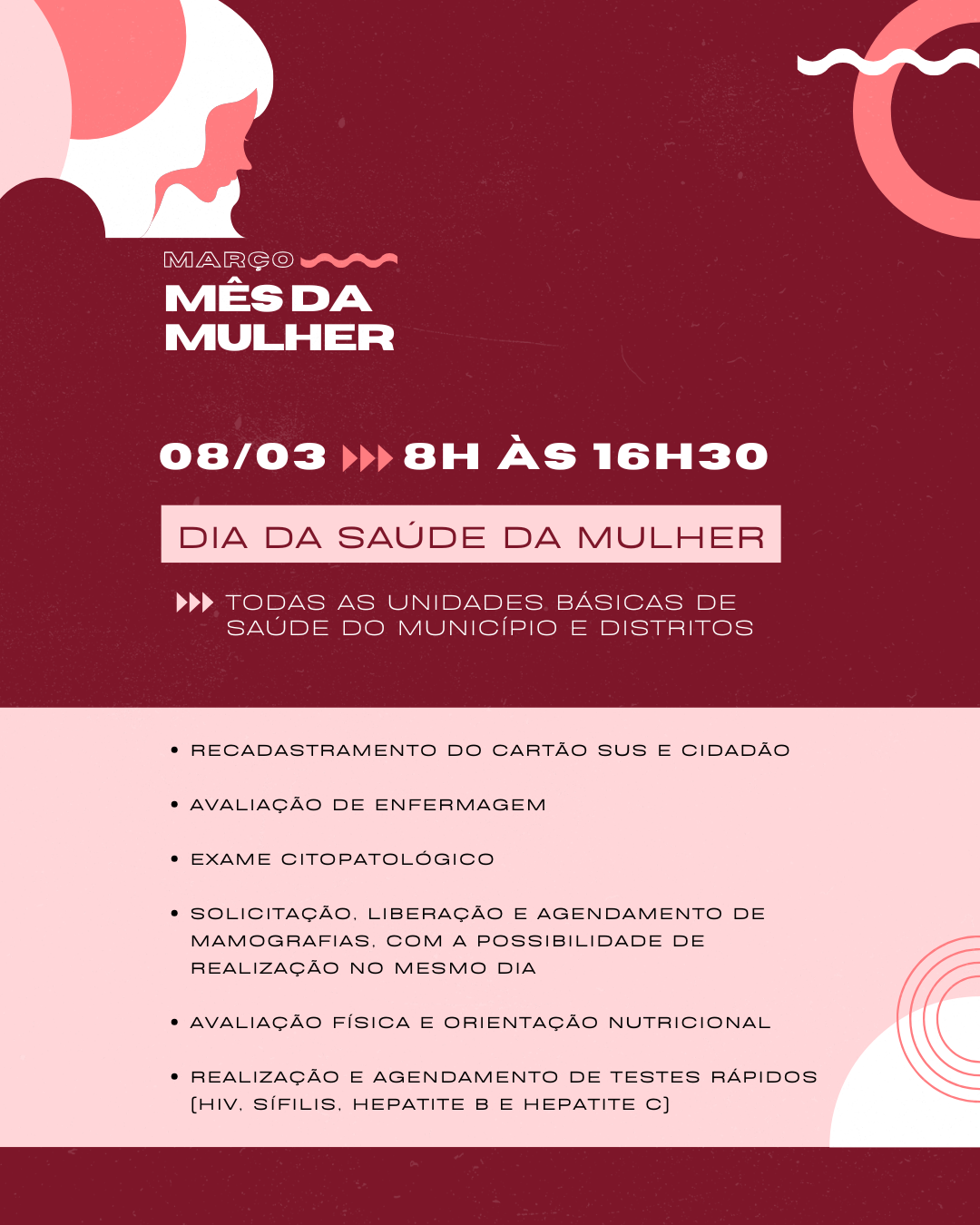 Haverá recadastramento do cartão SUS e cidadão; avaliação de enfermagem; exame citopatológico; solicitação, liberação e agendamento de mamografias, com a possibilidade de realização no mesmo dia; avaliação física e orientação nutricional; realização e agendamento de testes rápidos (HIV, sífilis, hepatite B e hepatite C); orientações sobre grupo de apoio ao combate do tabagismo, saúde da mulher e planejamento familiar e saúde mental feminina; além de parcerias para embelezamento das mulheres durante os atendimentos.