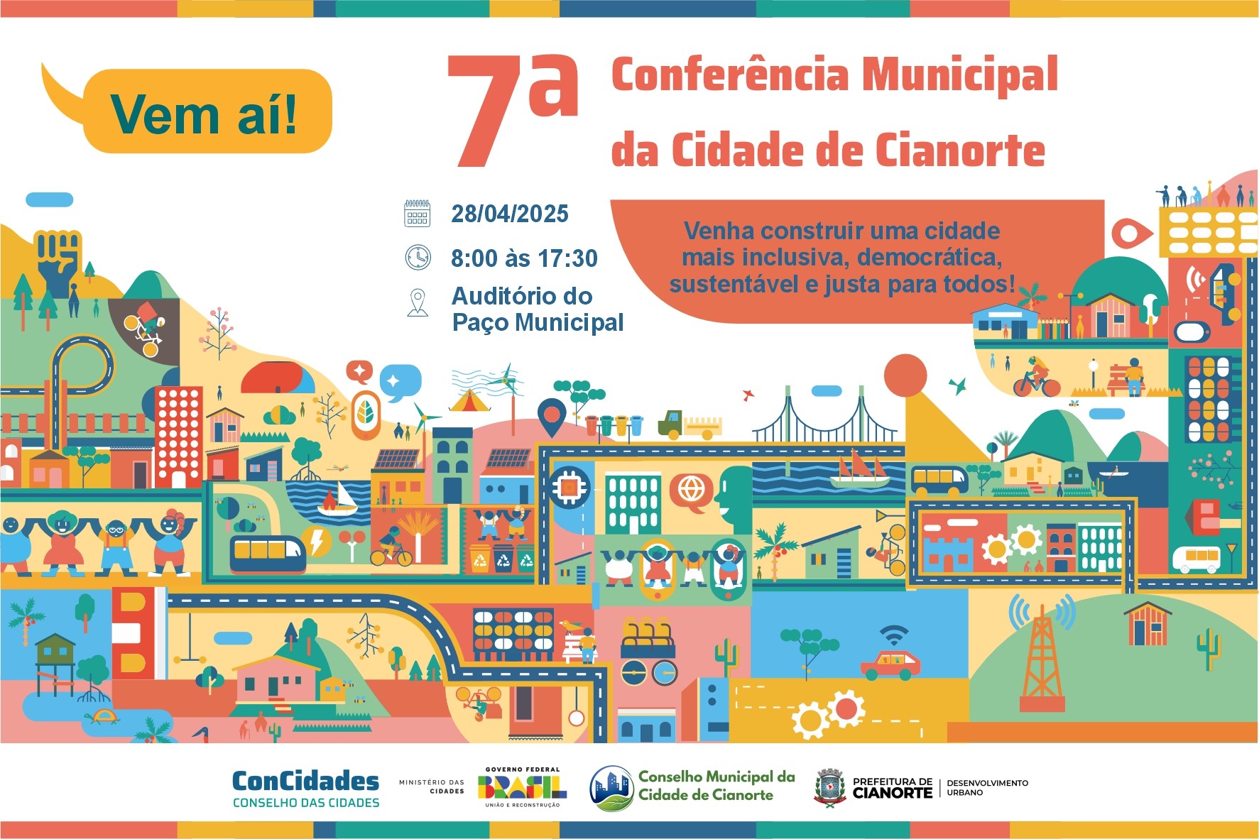 Com o tema “Construindo a Política de Desenvolvimento Urbano: caminhos para cidades inclusivas, democráticas, sustentáveis e com justiça social”, será realizada, no dia 28 de abril, das 8h às 17h30, no auditório do Paço Municipal, a 7ª Conferência Municipal das Cidades. Para participar, basta preencher formulário on-line, até o dia 24 de abril, disponível no site do Município (www.cianorte.pr.gov.br), na área do banner rotativo. Também será possível inscrever-se presencialmente, no dia do evento.