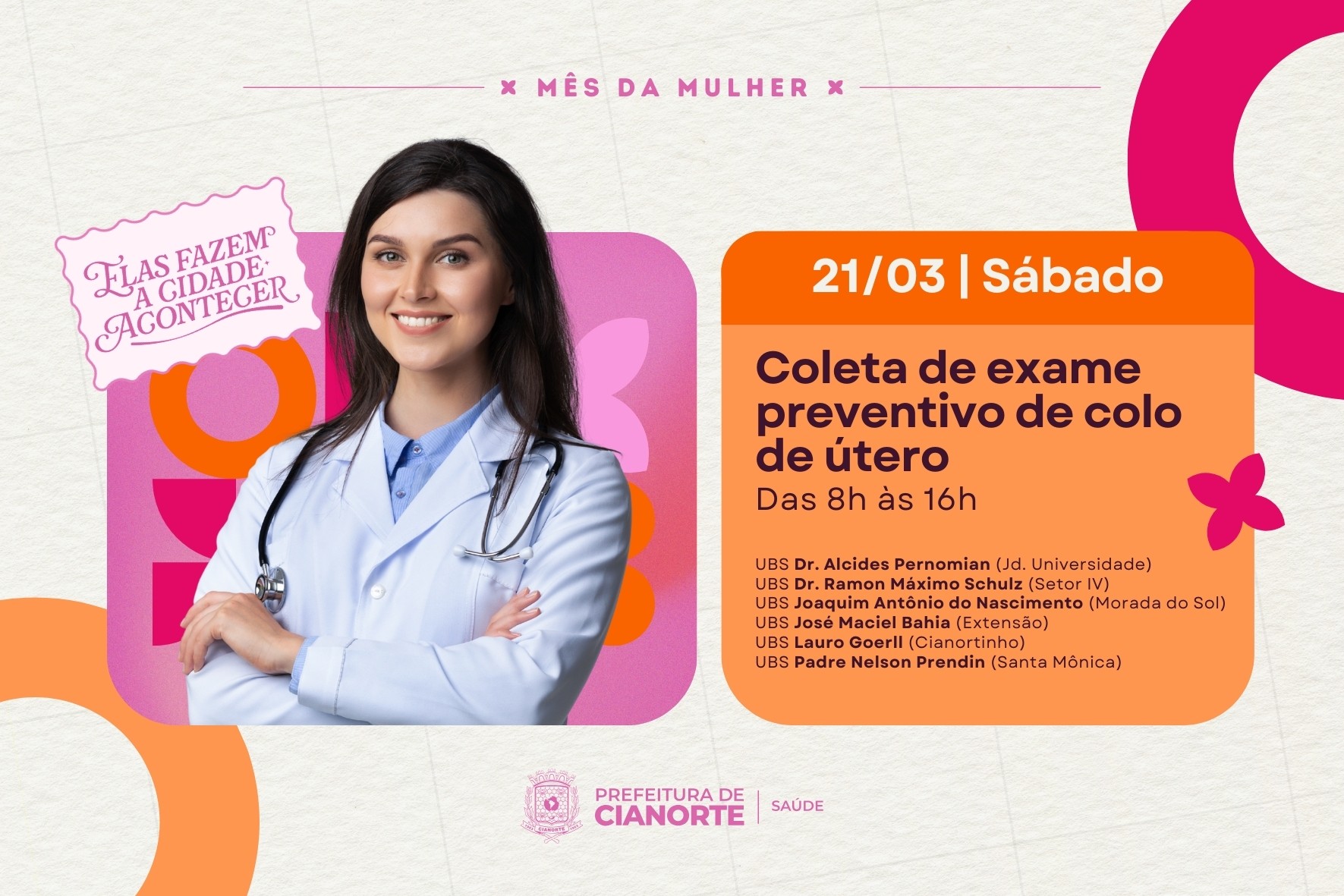 As cianortenses têm um importante compromisso neste sábado (21): a prevenção contra os cânceres de colo de útero e de mama. Isto porque, como parte da programação especial em alusão ao Mês da Mulher, a Secretaria Municipal de Saúde está promovendo um mutirão de atendimento, com o funcionamento das Unidades Básicas de Saúde aos sábados, em datas escalonadas.