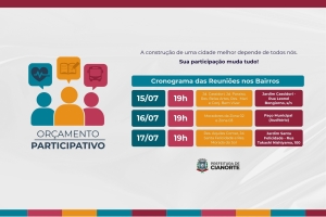Na terça-feira (15), a reunião abrangerá os moradores do Jardim Cassidori, Jardim Paraíso, Residencial Belas Artes, Residencial Mari e Conjunto Bem Viver. O encontro ocorrerá no salão comunitário do Jardim Cassidori, na Rua Leonel Bongiorno, s/n. Na quarta-feira (16), será a vez dos moradores da Zona 02 e Zona 03 contribuírem com suas propostas. A reunião acontecerá no Paço Municipal (auditório). O último encontro desta semana, na quinta-feira (17), será destinado aos residentes do Residencial Aquiles Comar, Jardim Santa Felicidade e Residencial Morada do Sol. A reunião será no Jardim Santa Felicidade, na Rua Takashi Nishiyama, 100.