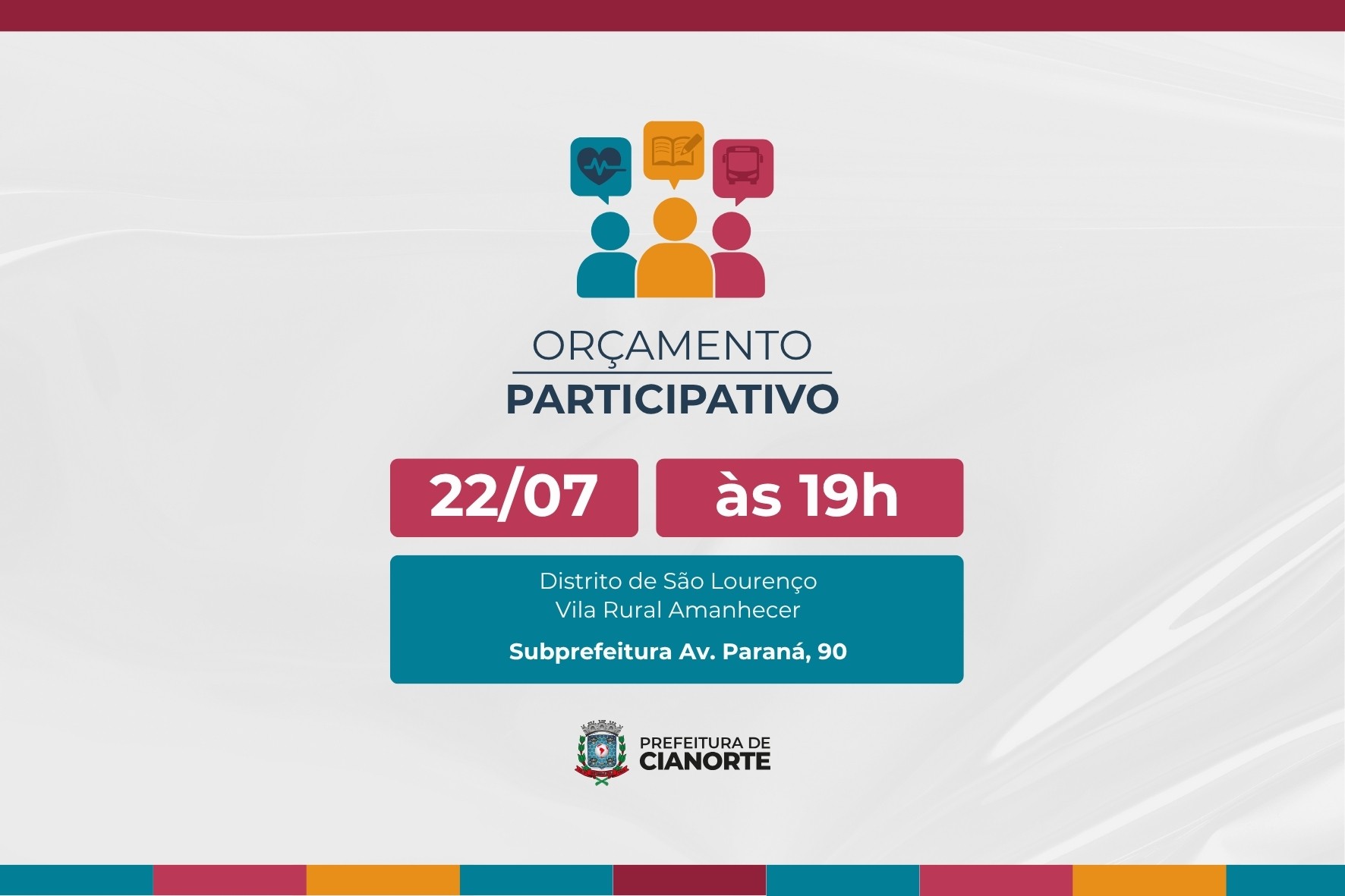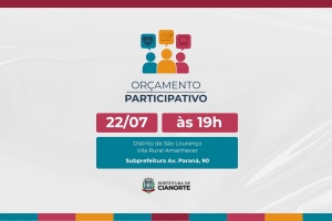 A nona e última reunião presencial com moradores para a elaboração do Plano Plurianual (PPA) 2026-2029 será nesta terça-feira (22), em São Lourenço, contemplando moradores do distrito e da Vila Rural Amanhecer. O encontro será na subprefeitura (Av. Paraná, 90), às 19h, e visa colher as demandas e sugestões da população da localidade para os próximos quatro anos.