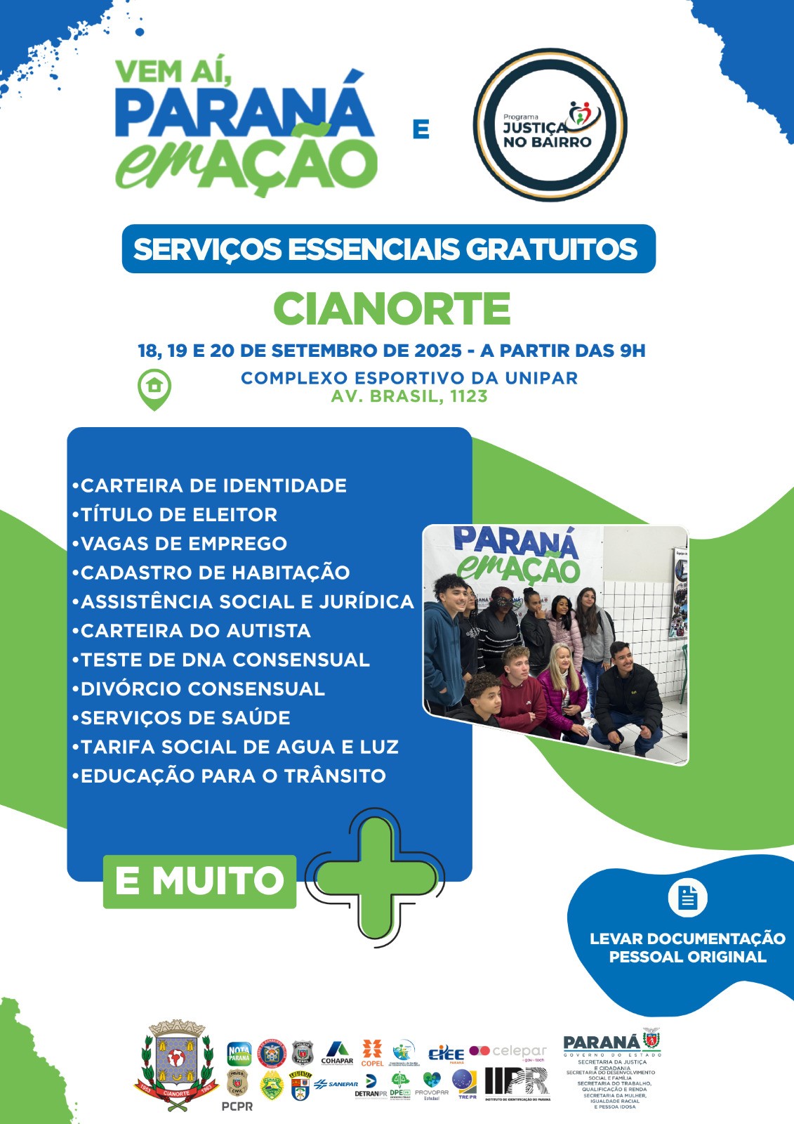 Nos dias 18, 19 e 20 de setembro, das 9h às 17h, Cianorte receberá o "Paraná em Ação", programa do Governo do Estado, por meio da Secretaria da Justiça e Cidadania, que atuará em parceria com o “Justiça no Bairro”. O evento, que acontecerá no Complexo Esportivo da Unipar (Av. Brasil, 1123), tem o objetivo de levar serviços essenciais gratuitos à população.