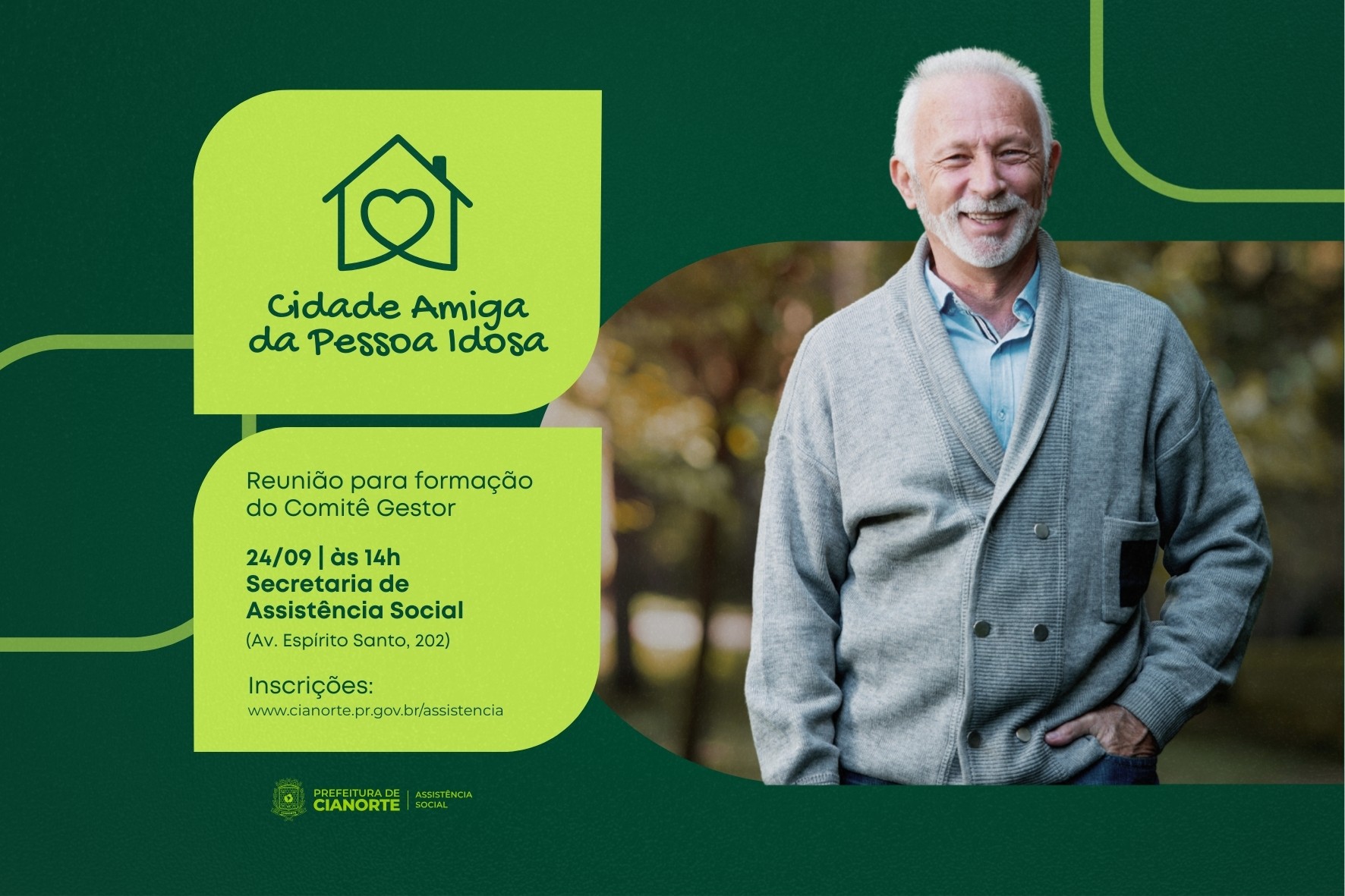 A participação é aberta a todos os interessados e pode ser confirmada através de um formulário online, disponível no site do Município (www.cianorte.pr.gov.br/assistencia). A iniciativa busca filiação ao projeto do estado do Paraná, o primeiro da América Latina a receber o título de “Estado Amigo da Pessoa Idosa” pela Organização das Nações Unidas (ONU). Em Cianorte, a proposta se baseará em três pilares fundamentais: cuidar das pessoas; cuidar e fortalecer as famílias; e cuidar e preparar as cidades.