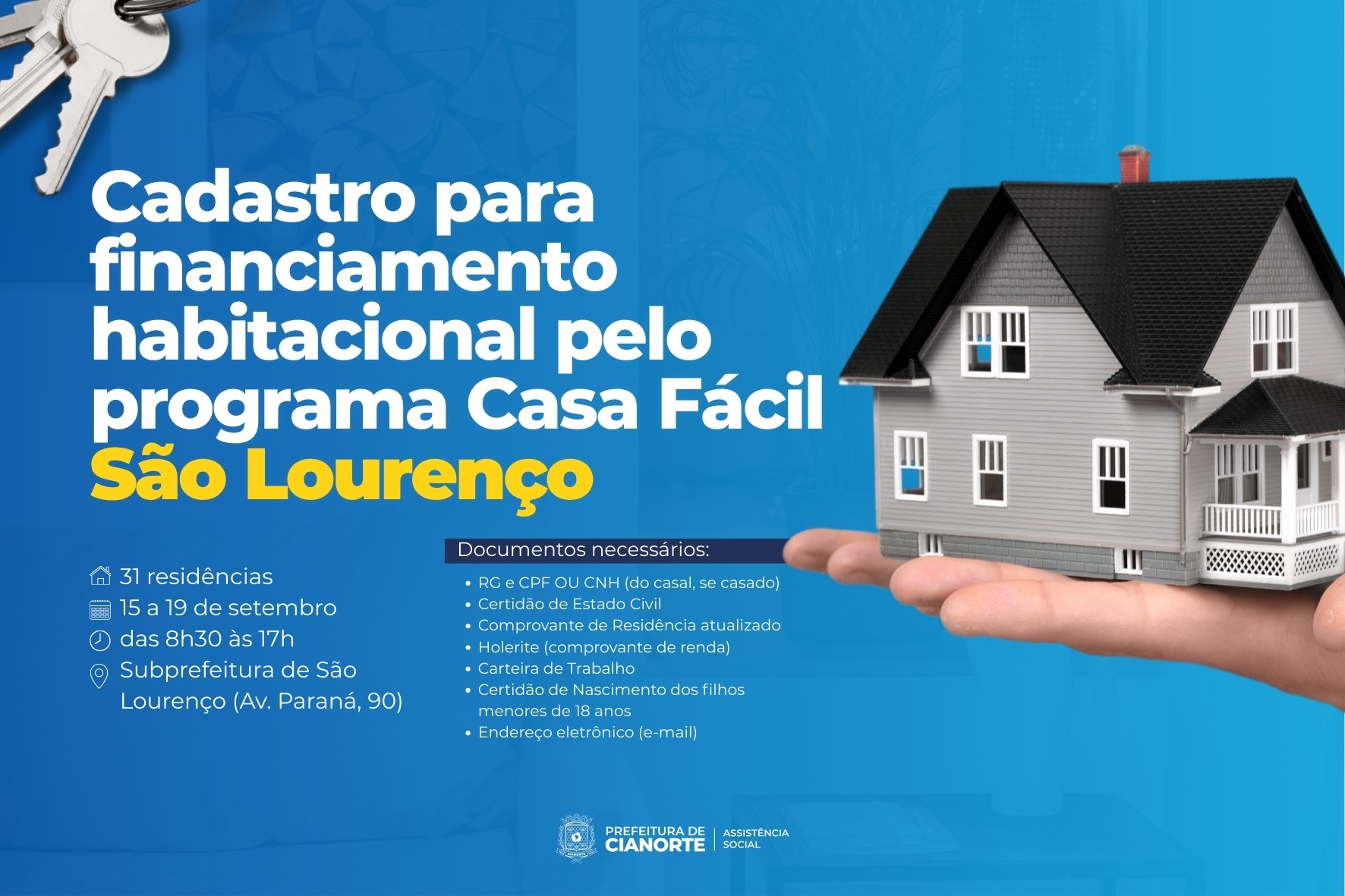 Famílias de São Lourenço que sonham com a casa própria têm apenas até esta sexta-feira (20) para participar da triagem de candidatos para o programa habitacional Casa Fácil. A Secretaria Municipal de Assistência Social, por meio da Divisão de Assuntos Comunitários, reabriu o processo para identificar os cidadãos que atendem aos critérios para financiamento de 31 novas residências no distrito.