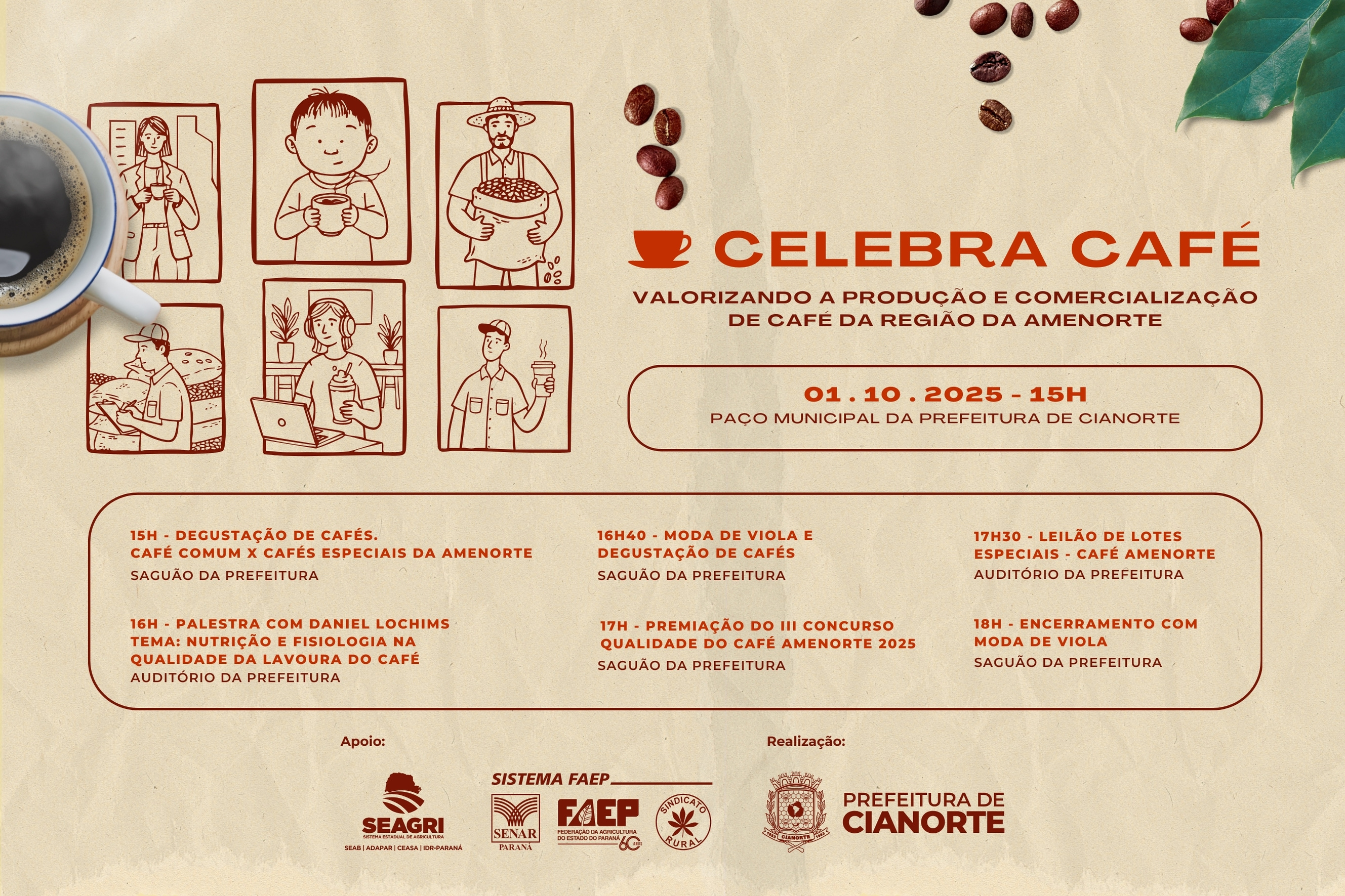 “O Celebra Café vem com relevância estratégica para nossa cidade, reafirmando o compromisso do município com o fortalecimento da agroindústria, a valorização da produção local, o incentivo à qualidade no campo e a abertura de novos mercados. Assim, reforçamos o convite”, destaca o secretário municipal de Agricultura, Anizio Menarim Filho. A programação será encerrada às 18h com mais moda de viola e um coffee break especial.