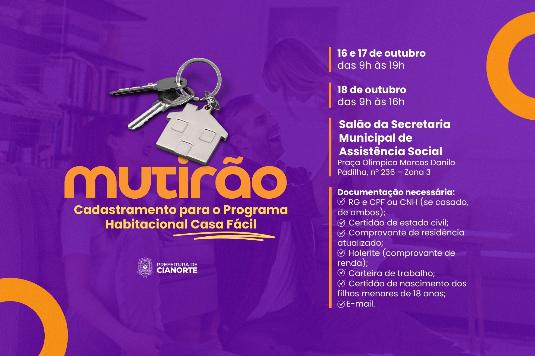 Os cianortenses que desejam ingressar ou garantir a atualização do cadastro no Programa Habitacional Casa Fácil, do Governo do Paraná (Cohapar), têm a oportunidade no mutirão de atendimento que será realizado pela Secretaria Municipal de Assistência Social, nesta quinta e sexta-feira (16 e 17), das 9h às 19h, e no sábado (18), das 9h às 16h, no Salão de Reunião da Secretaria Municipal de Assistência Social, localizado na Praça Olímpica Marcos Danilo Padilha, nº 236 – Zona 3 (antigo Centro Social Urbano).