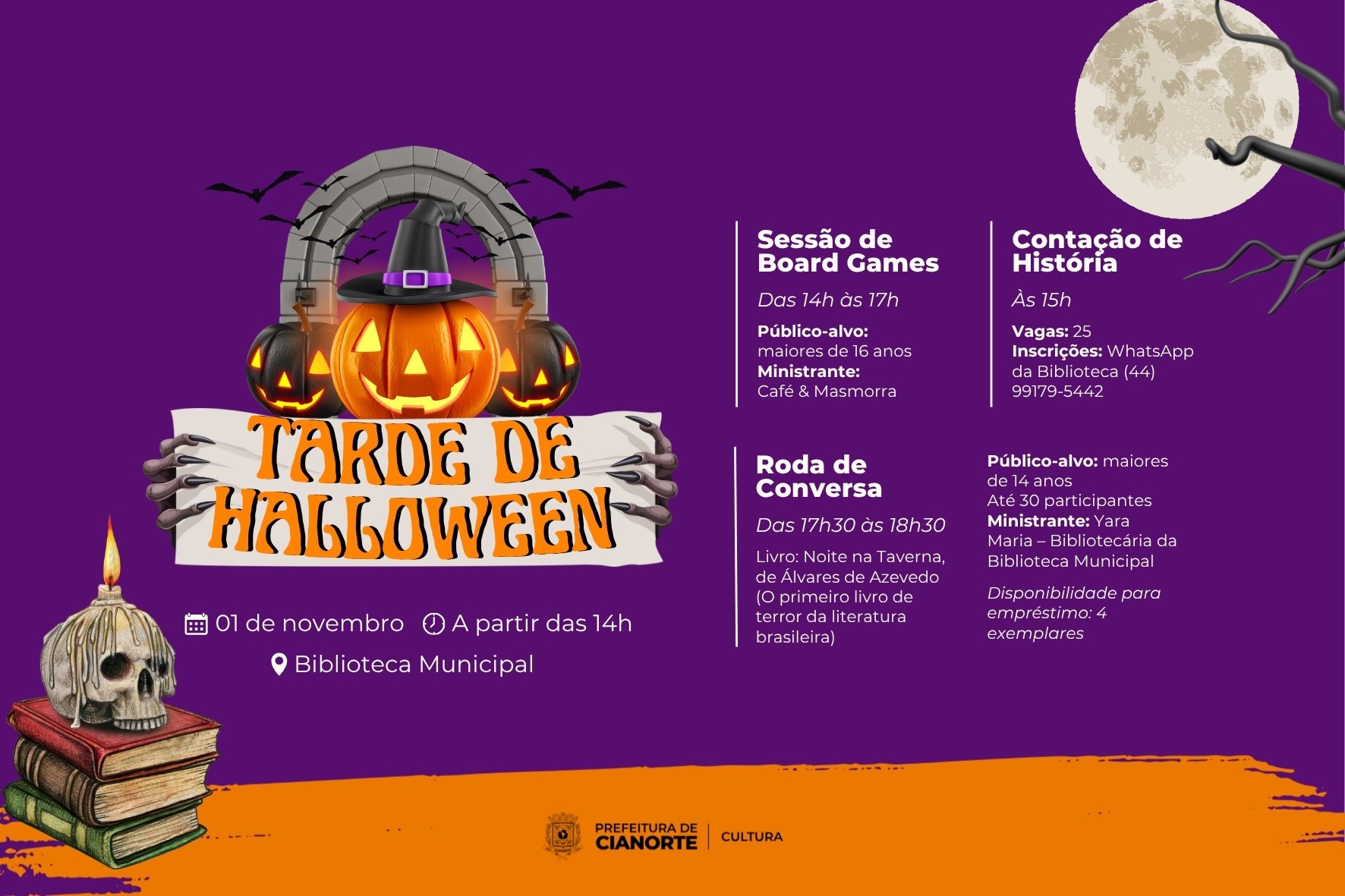 “A Tarde Temática de Halloween é uma excelente oportunidade para o público de diversas idades se reunir, se divertir e explorar o universo do mistério e do terror na literatura e nos jogos. Com este evento, estamos efetivando o papel da biblioteca como um espaço de sociabilidade que democratiza o acesso ao conhecimento e à cultura”, destacou o secretário municipal de Cultura, Evandro de Castro.