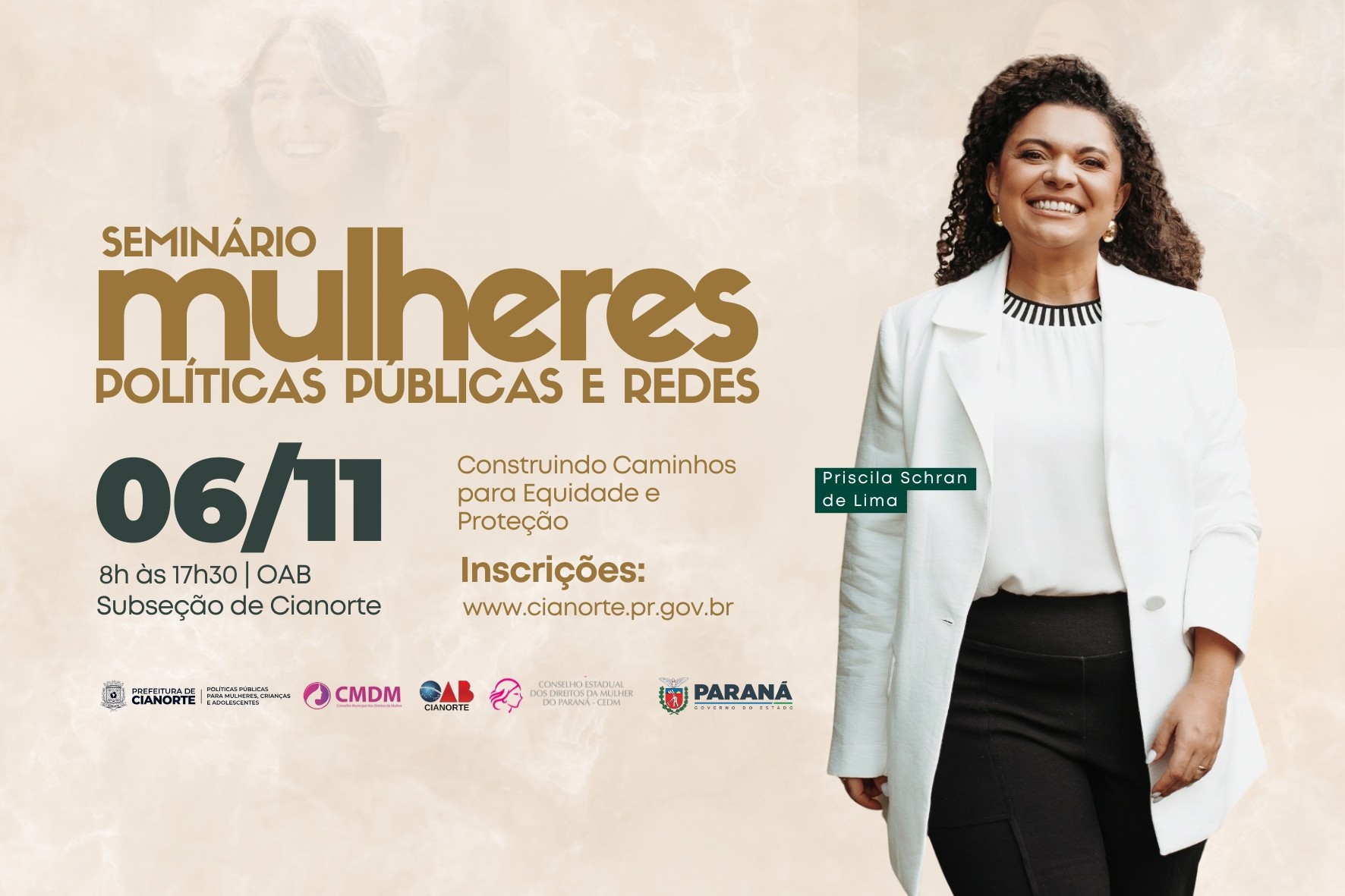 Priscila ministrará as palestras “A Política da Mulher como Política de Todos: Protagonismo e Transversalidade”, às 9h; e “Enfrentamento à Violência contra a Mulher: O Fenômeno e a Rede de Proteção”, às 13h30. A agenda inclui, ainda, momentos de debate com as mesas redondas: “Panorama do Protagonismo Feminino em Cianorte”, às 11h; e “Panorama da Rede de Atendimento à Mulher em Situação de Violência em Cianorte”, às 16h.