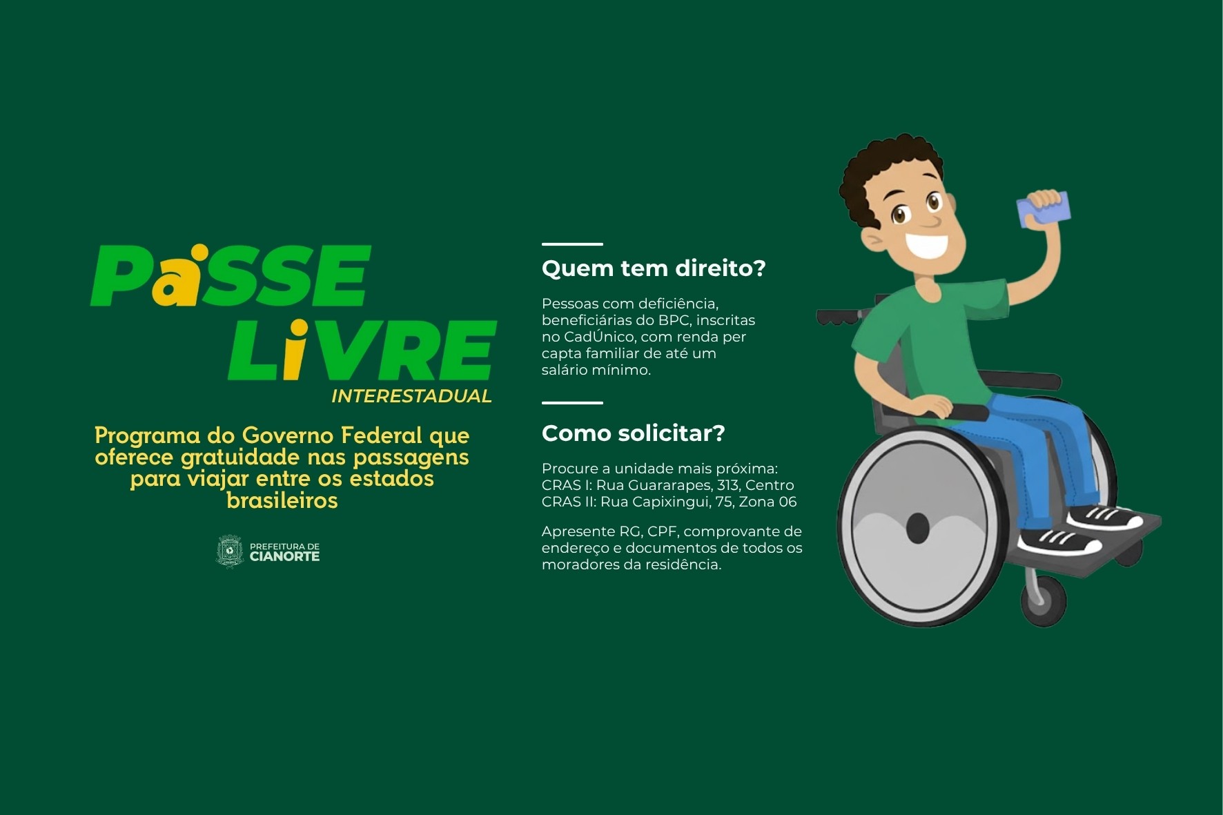 COMO SOLICITAR – Para quem já é beneficiário do BPC, o processo começa com a visita ao CRAS mais próximo (Rua Guararapes, 313, Centro, ou Rua Capixingui, 75, Zona 06), onde deve apresentar RG e CPF, comprovante de residência e documentos dos outros membros da família. O CRAS realizará o cadastro social e agendará atendimento com um técnico especializado. Após a análise, a carteirinha do Passe Livre será emitida. Se o beneficiário precisar de acompanhante durante as viagens, ele deve procurar a UBS do Setor 03, Cianortinho, São Lourenço ou Vidigal para que o médico faça a inclusão no sistema.
