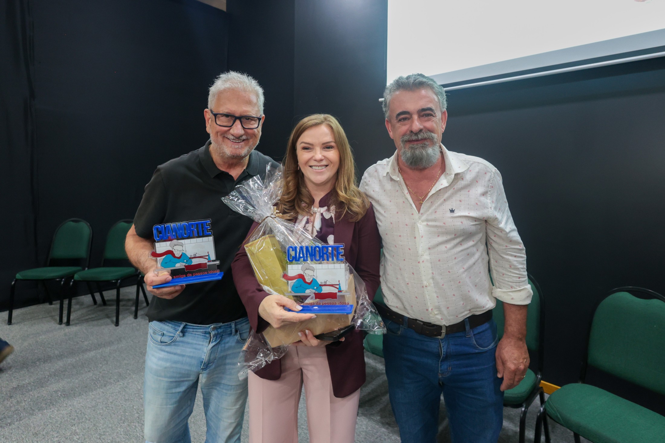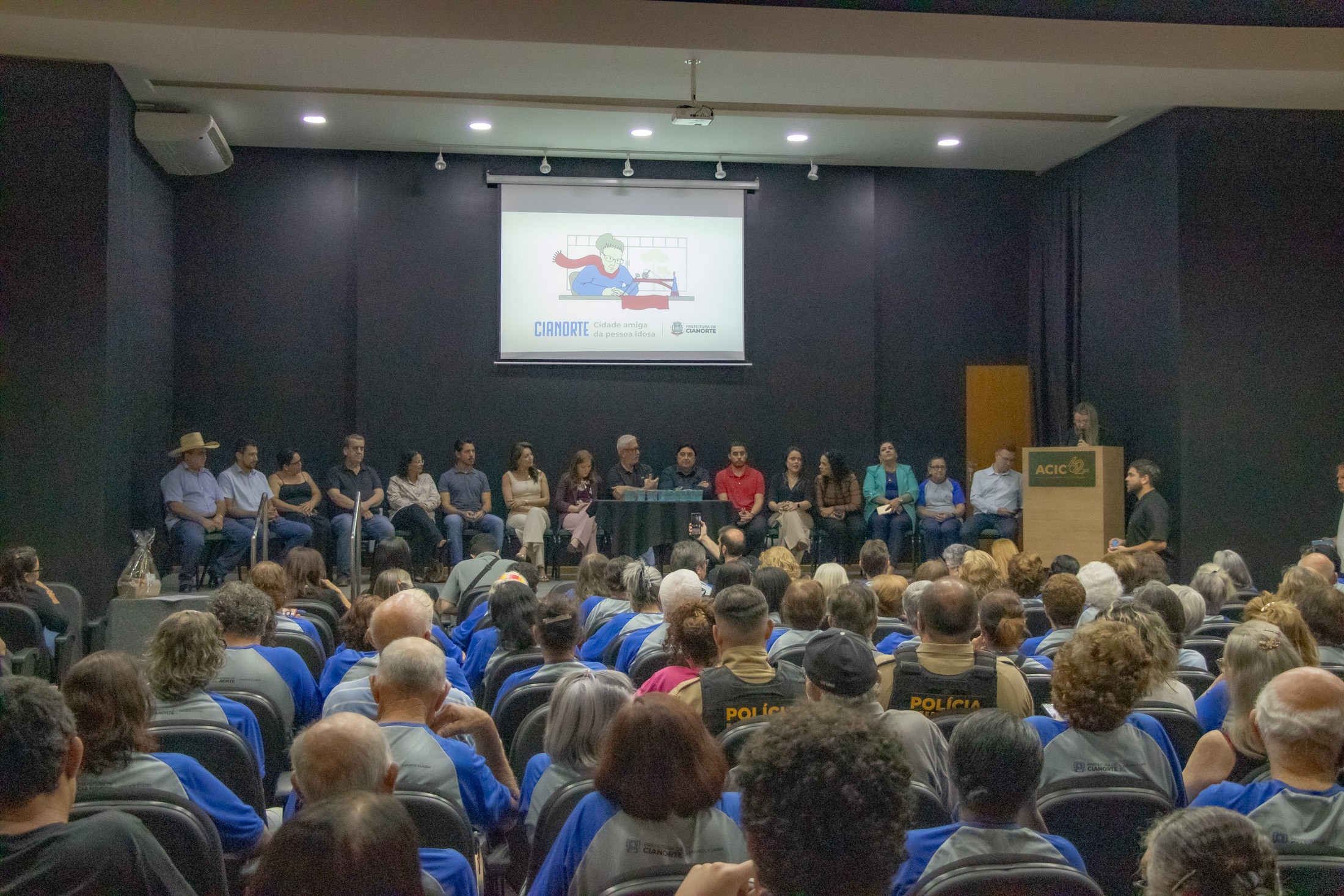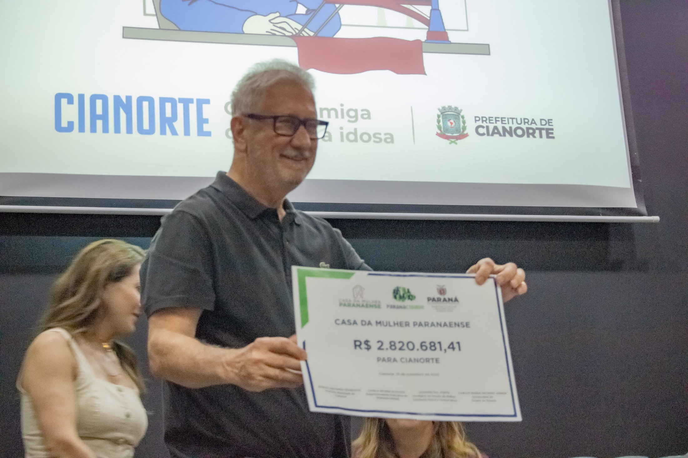 PRESENÇAS: Também participaram da solenidade: representando o vice-prefeito, Fão Manfrinato, sua esposa, Neia Manfrinato; o presidente da Câmara Municipal, Victor Hugo Davanço, acompanhado das vereadoras Professora Kelly e Marisa Franco; a promotora de Justiça, Dra. Elaine Lopo Rodrigues; o presidente da Amenorte e prefeito de Rondon, Roberto Aparecido Corredato, acompanhado dos prefeitos Ronaldo Vilas Boas (Tapejara) e Vitor Hugo Rodrigues (São Manoel do Paraná); os secretários municipais Lucas Meira Pereira (Esporte), Stephanie Piveta Azevedo (Mulher) e Neilson Etanio de Sousa (Saúde); a presidente do Conselho Municipal dos Direitos da Pessoa Idosa, Iraci de Souza Sarges Gavron; representando o Núcleo Municipal do Cuidado (NUMUC), Helen Cristiane Cardoso; representando todos os idosos cianortenses, Antônia Batista Domingos; e o presidente da ACIC, Mário dos Anjos Neto.