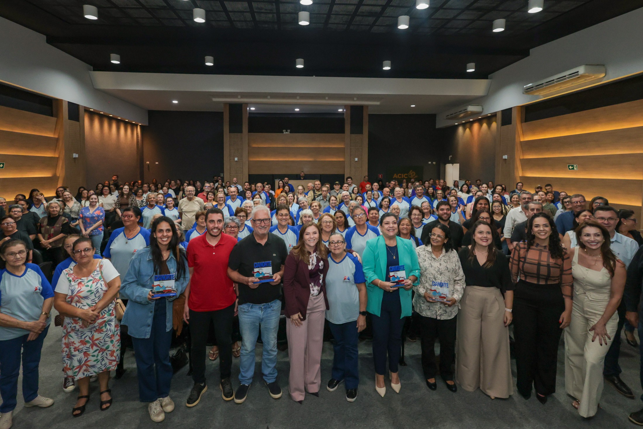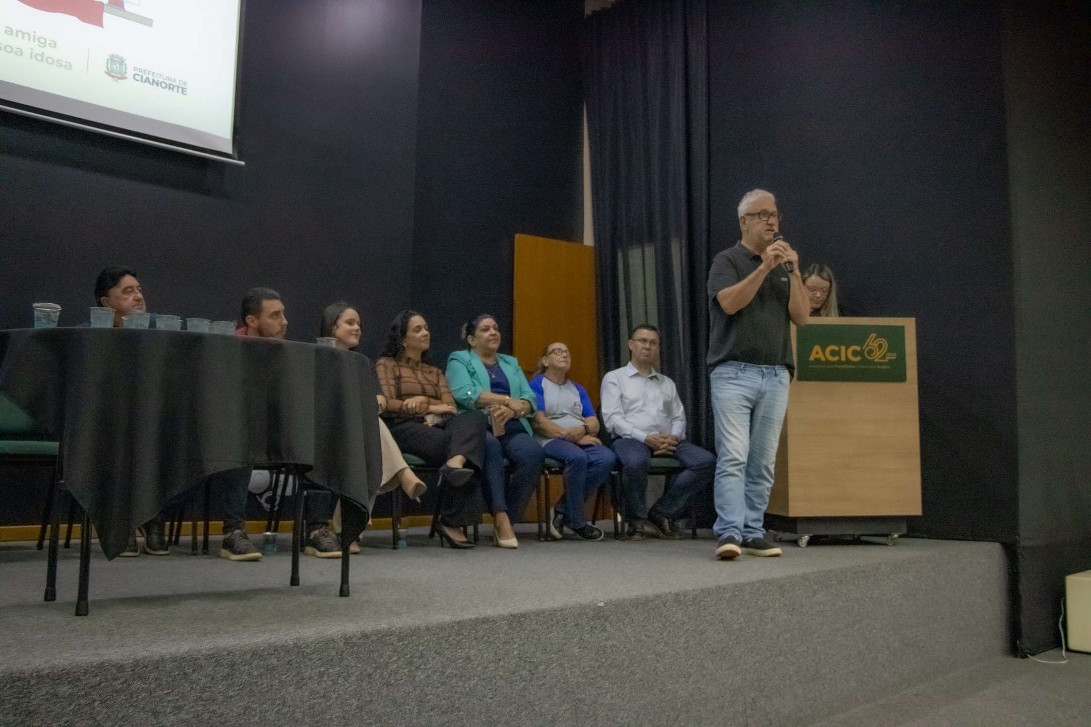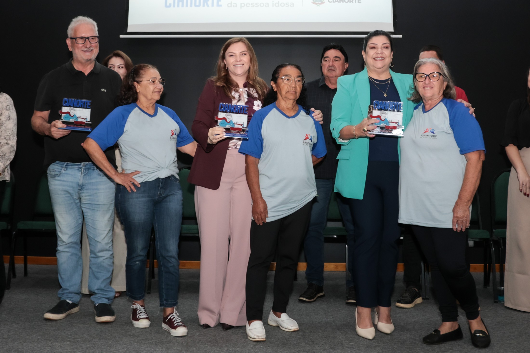 PRESENÇAS: Também participaram da solenidade: representando o vice-prefeito, Fão Manfrinato, sua esposa, Neia Manfrinato; o presidente da Câmara Municipal, Victor Hugo Davanço, acompanhado das vereadoras Professora Kelly e Marisa Franco; a promotora de Justiça, Dra. Elaine Lopo Rodrigues; o presidente da Amenorte e prefeito de Rondon, Roberto Aparecido Corredato, acompanhado dos prefeitos Ronaldo Vilas Boas (Tapejara) e Vitor Hugo Rodrigues (São Manoel do Paraná); os secretários municipais Lucas Meira Pereira (Esporte), Stephanie Piveta Azevedo (Mulher) e Neilson Etanio de Sousa (Saúde); a presidente do Conselho Municipal dos Direitos da Pessoa Idosa, Iraci de Souza Sarges Gavron; representando o Núcleo Municipal do Cuidado (NUMUC), Helen Cristiane Cardoso; representando todos os idosos cianortenses, Antônia Batista Domingos; e o presidente da ACIC, Mário dos Anjos Neto.