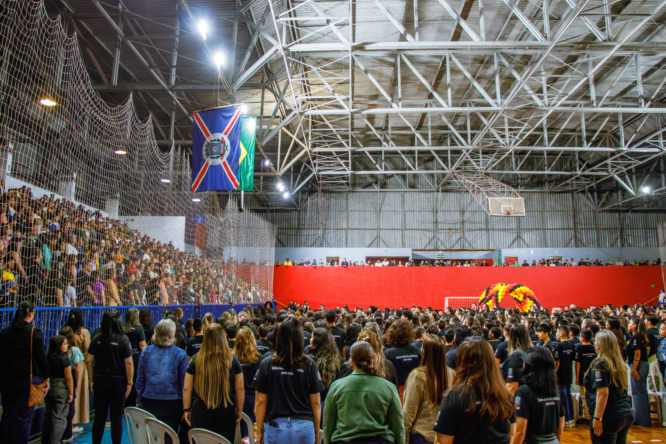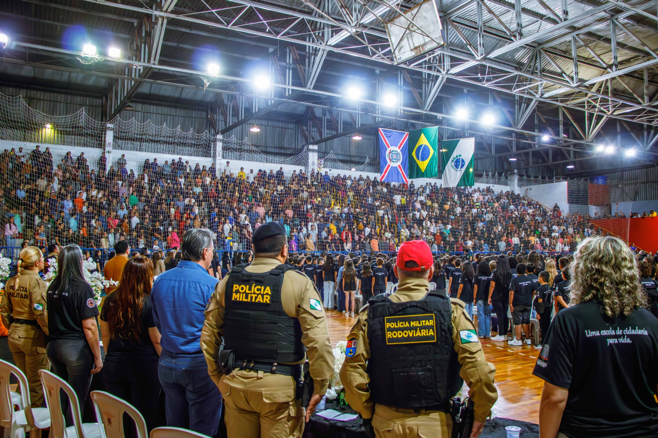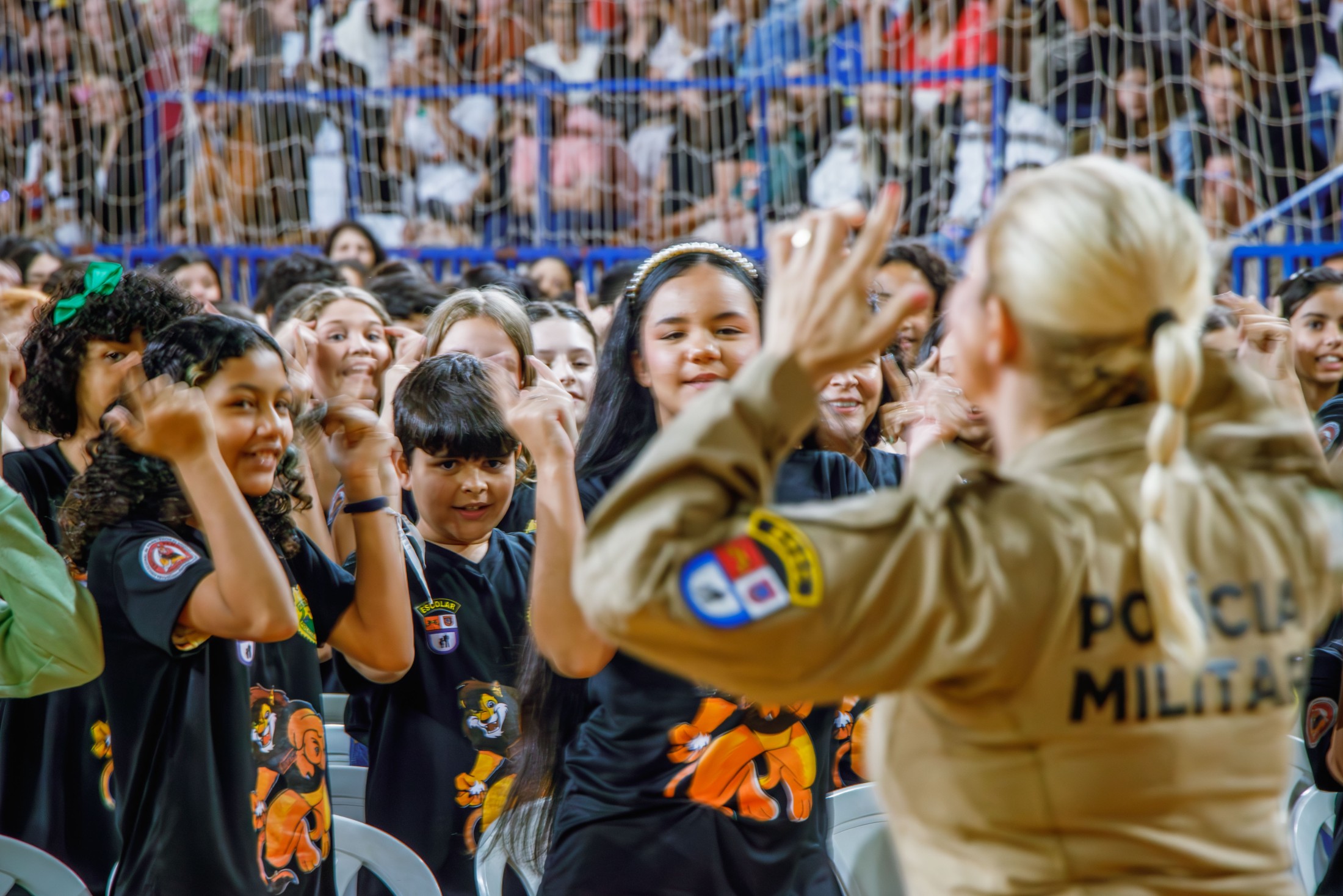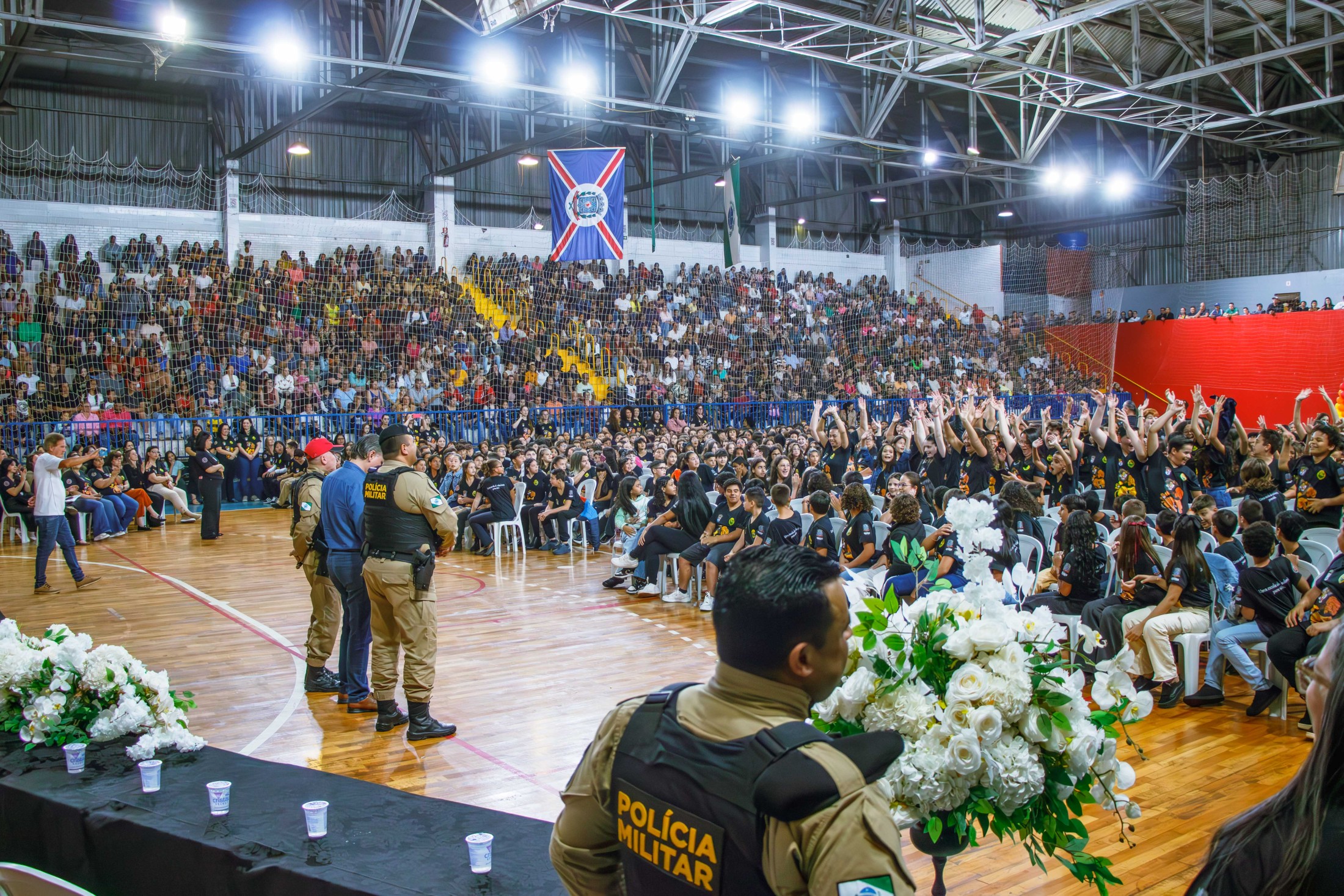 Emoção e alegria marcaram a solenidade de formatura do Programa Educacional de Resistência às Drogas e à Violência – Proerd, realizada na noite dessa terça-feira (18), no Ginásio de Esportes Tancredo Neves (Tancredão). O evento reuniu mais de 3 mil pessoas, entre autoridades, militares, profissionais da educação, familiares e mais de 900 estudantes do 5º ano do Ensino Fundamental, das 15 escolas da rede municipal de ensino, participantes do programa.