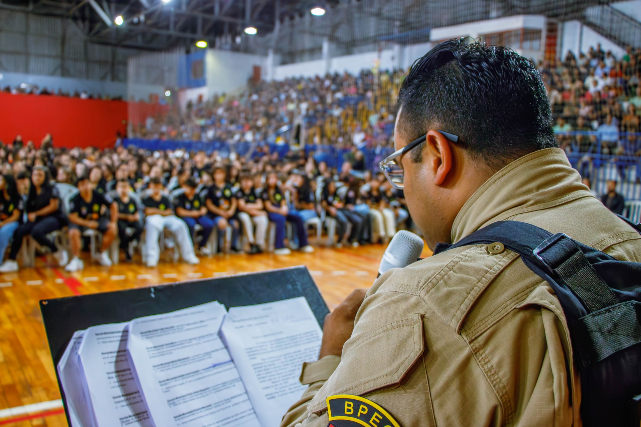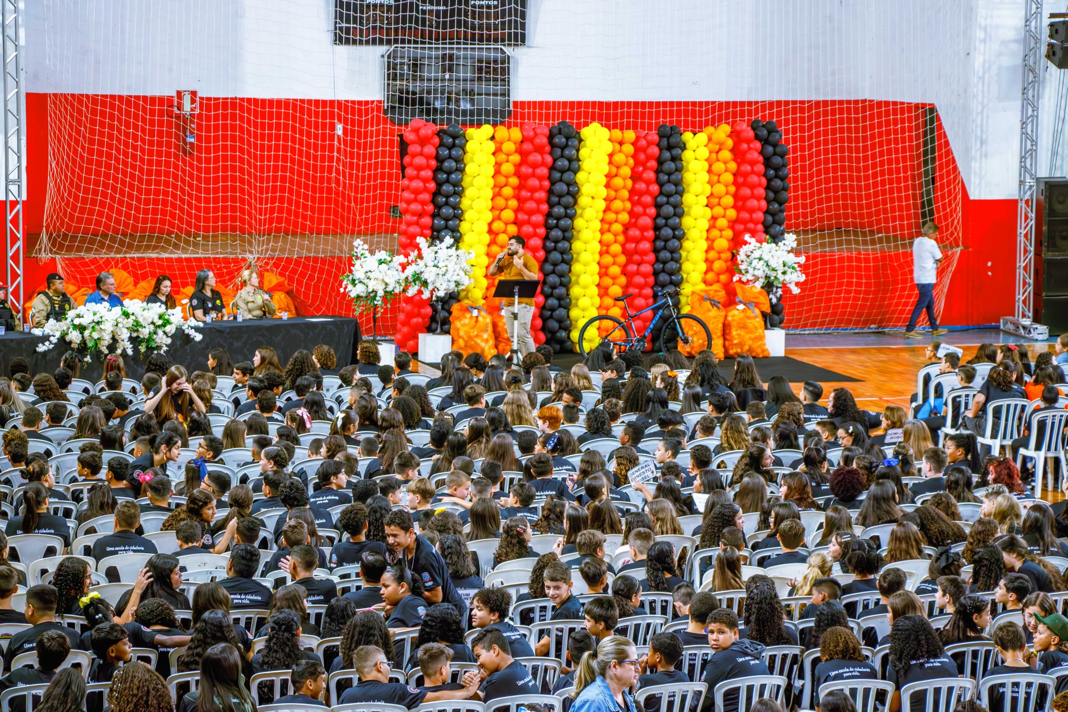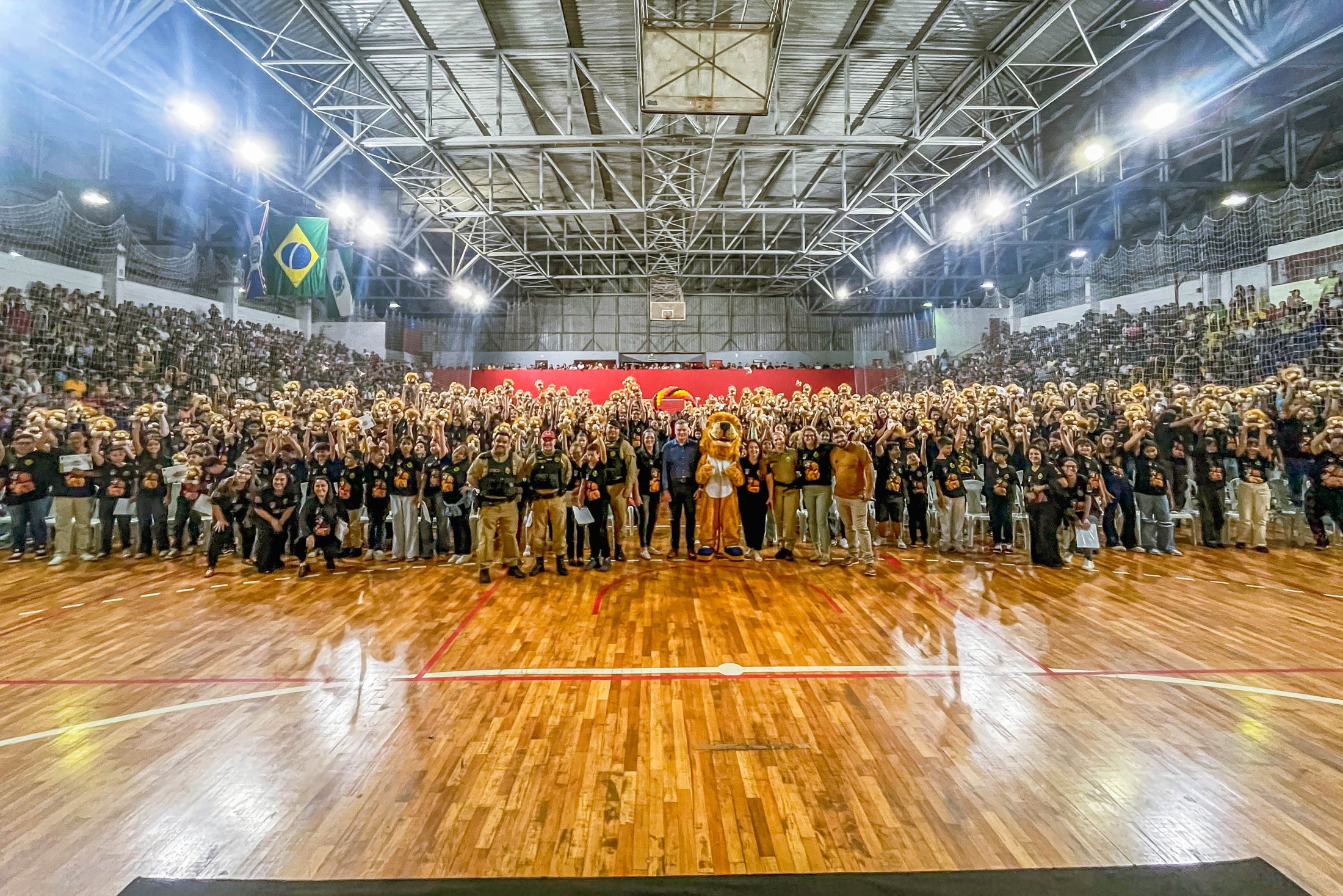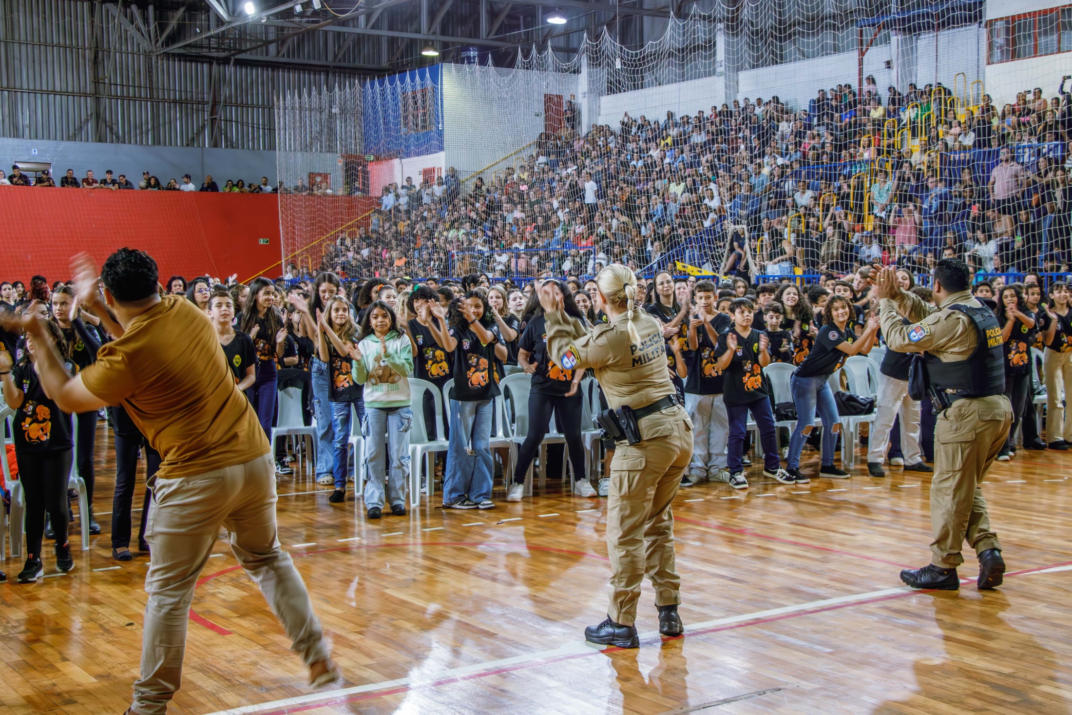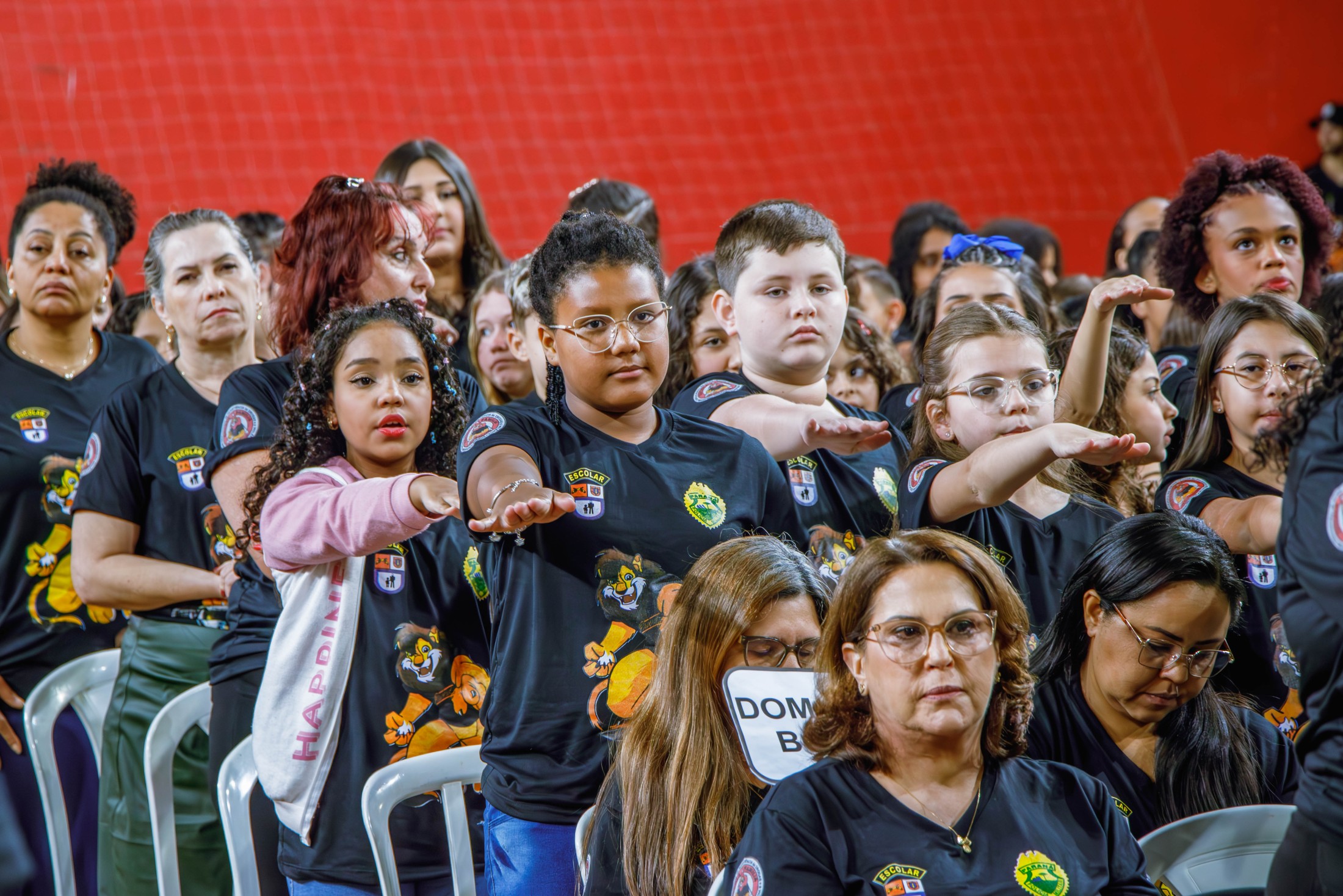 Emoção e alegria marcaram a solenidade de formatura do Programa Educacional de Resistência às Drogas e à Violência – Proerd, realizada na noite dessa terça-feira (18), no Ginásio de Esportes Tancredo Neves (Tancredão). O evento reuniu mais de 3 mil pessoas, entre autoridades, militares, profissionais da educação, familiares e mais de 900 estudantes do 5º ano do Ensino Fundamental, das 15 escolas da rede municipal de ensino, participantes do programa.