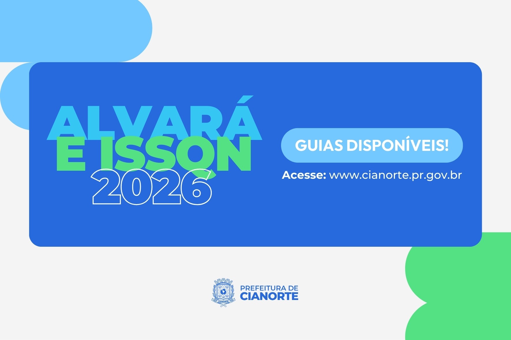 A Prefeitura informa que as guias para pagamento do Alvará e do Imposto Sobre Serviços de Qualquer Natureza (ISSQN) Fixo referentes ao ano de 2026 estão disponíveis no site do Município (www.cianorte.pr.gov.br), com acesso pelo banner rotativo ou pelo menu de Acesso Rápido, na opção “Geral”, botão “Carnê ALVARÁ – ISSQN” (https://cianorte.oxy.elotech.com.br/portal-contribuinte/consulta-carne).