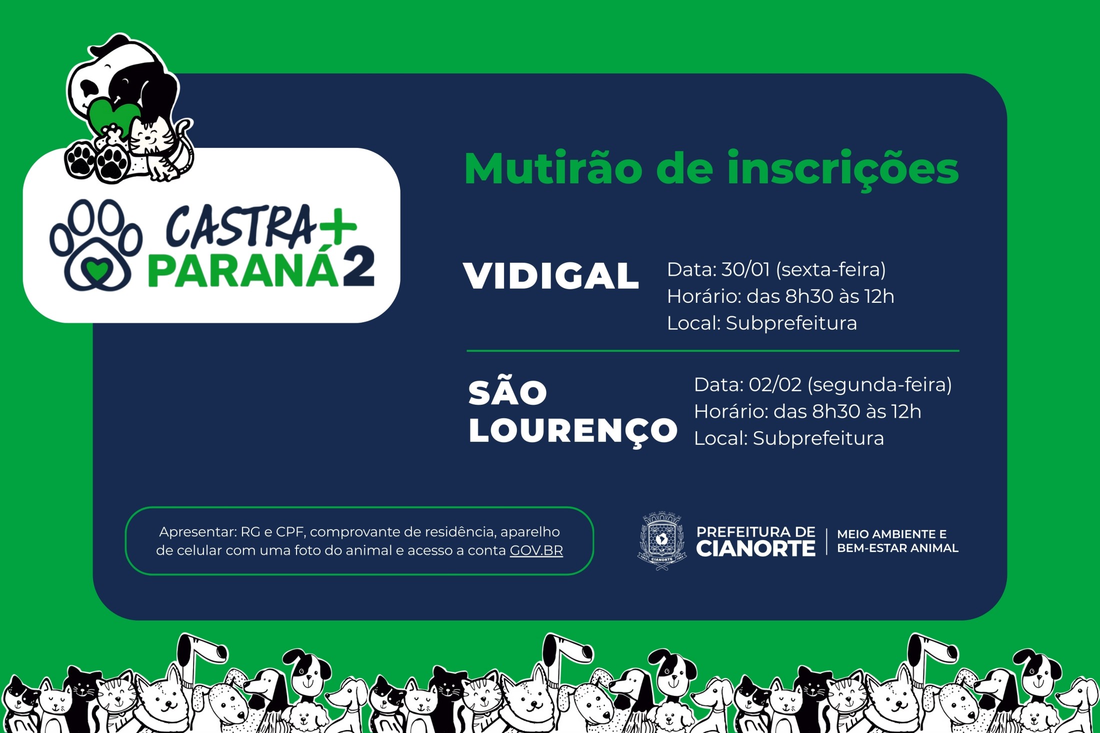 Com a chegada do Programa Castra Mais Paraná 2, agendada para os dias 19, 20 e 21 de fevereiro, Cianorte se prepara para aproveitar ao máximo a iniciativa, que disponibilizará entre 500 e 600 castrações gratuitas para cães e gatos no município.