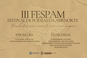 O III FESPAM é promovido pela Comissão Técnica Consultiva Especial de Cultura da 4ª Regional e gestores de cultura do CICENOP, com apoio da Secretaria Estadual de Cultura (SEEC/PR), Academia de Letras de Cianorte (ALC), Núcleo Regional de Educação (NRE) e Secretaria Municipal de Educação (SEMED).