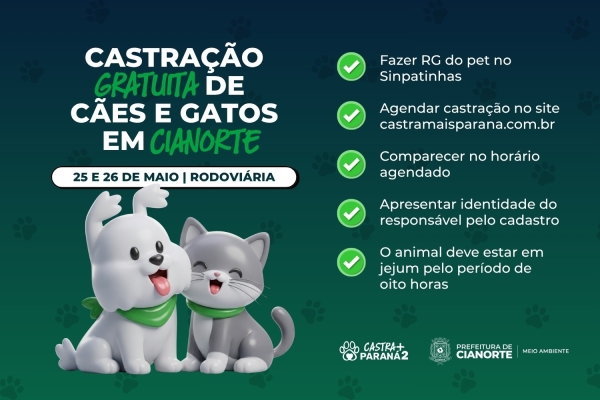 Abertas as inscrições para mutirão de castração gratuita de cães e gatos em Cianorte