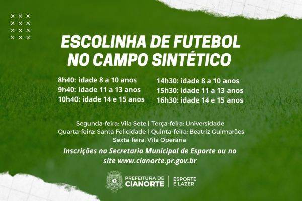 Secretaria de Esporte abre inscrições para escolinha de futebol em campo sintético